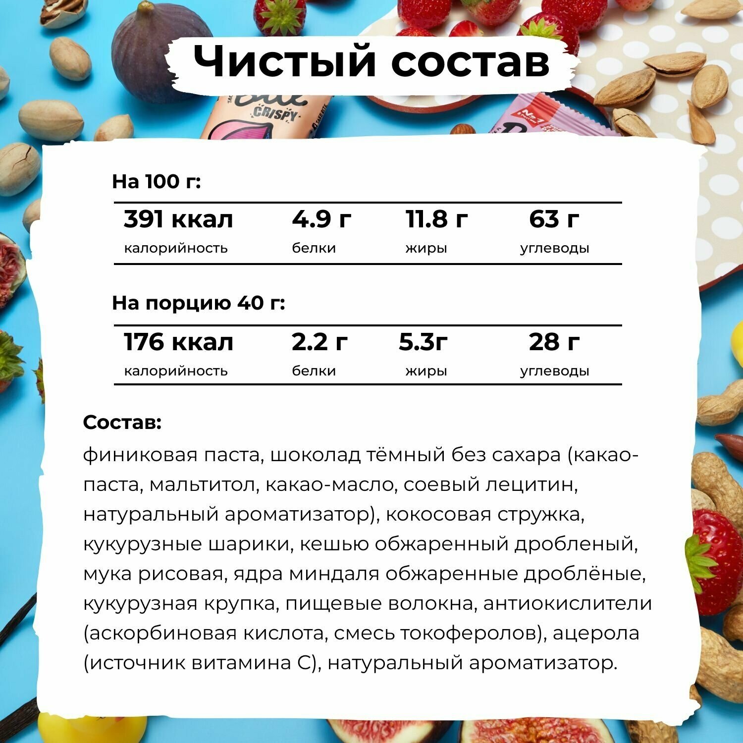 Bite Crispy это гармоничное и хрустящее сочетание мягкой орехово-фруктовой начинки, кукурузных криспов и темного шоколада, приготовленного по швейцарской рецептуре. Шоколад в батончиках Bite Crispy на 75% состоит из какао-бобов и не содержит сахара он заменяется подсластителем мальтитолом. В этих снеках нет глютена, консервантов, усилителей вкуса и добавленного сахара. Мы добавили в состав батончиков ацеролу (или же барбадосскую вишню), которая содержит в 50 раз больше витамина C, чем апельсин. А еще Bite Crispy подходят для вегетарианцев, веганов и даже астронавтов. Bite Crispy вкусный и абсолютно натуральный батончик.