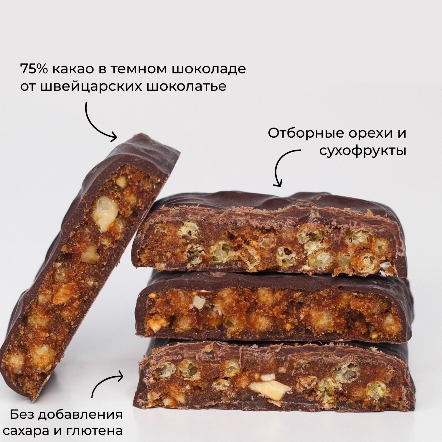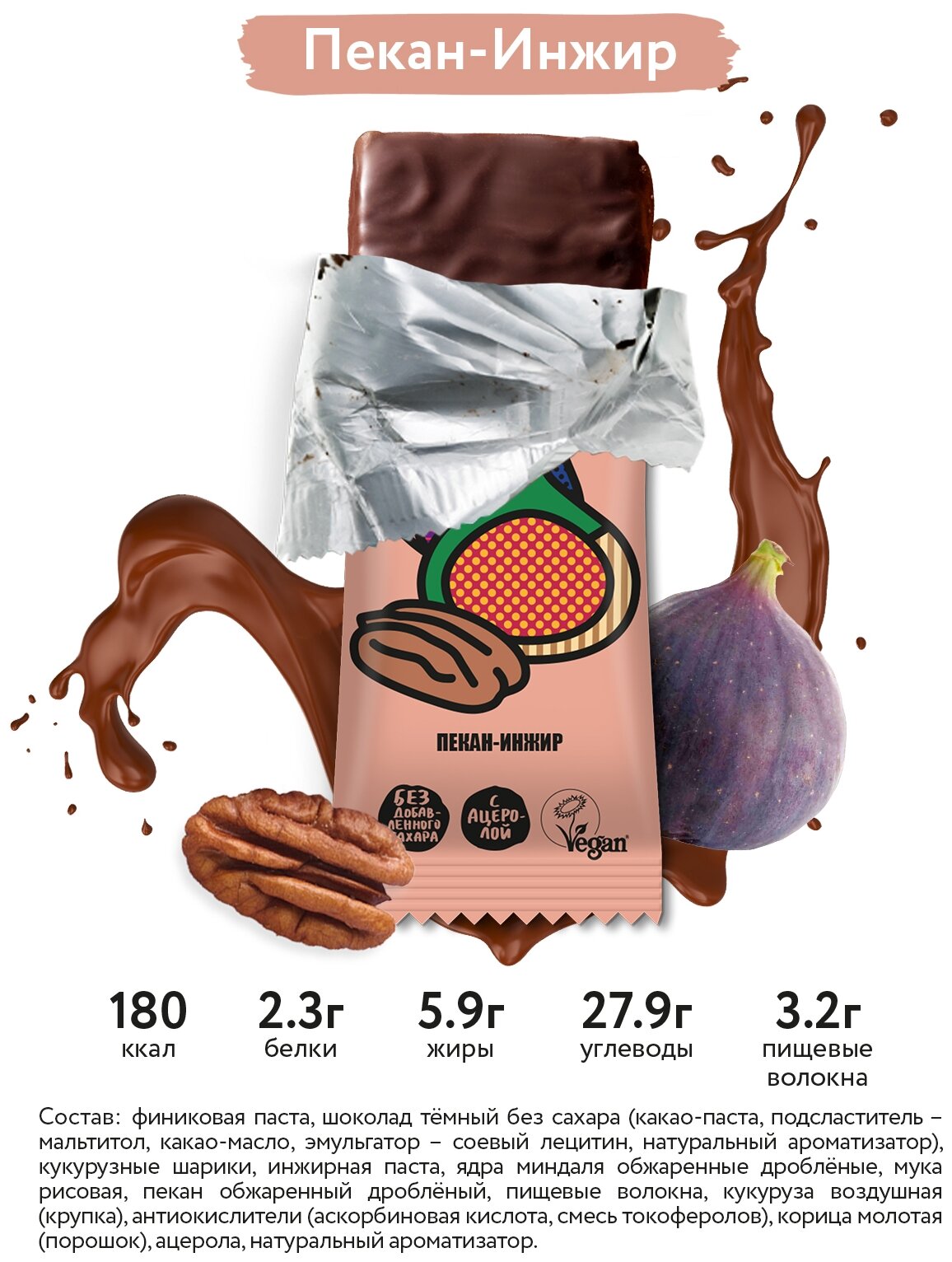 | Состав | Финиковая паста, шоколад тёмный без сахара (какао-паста, подсластитель - мальтитол, какао-масло, эмульгатор – соевый лецитин, натуральный ароматизатор), кукурузные шарики, инжирная паста, ядра миндаля обжаренные дроблёные, мука рисовая, пекан обжаренный дроблёный, пищевые волокна, кукуруза воздушная (крупка), антиокислители (аскорбиновая кислота, смесь токоферолов), корица молотая (порошок), ацерола*, натуральный ароматизатор. * Ацерола – природный источник витамина С. |