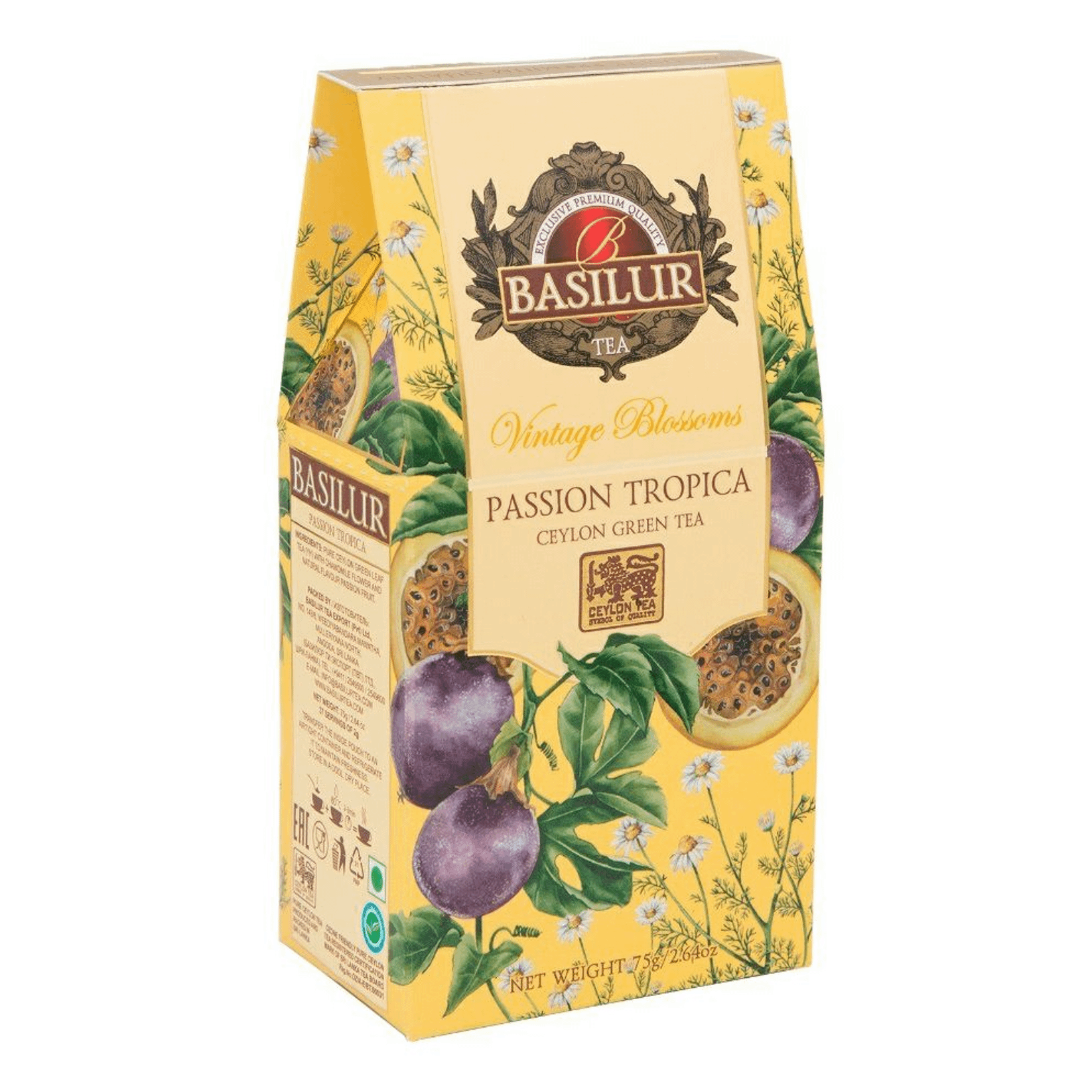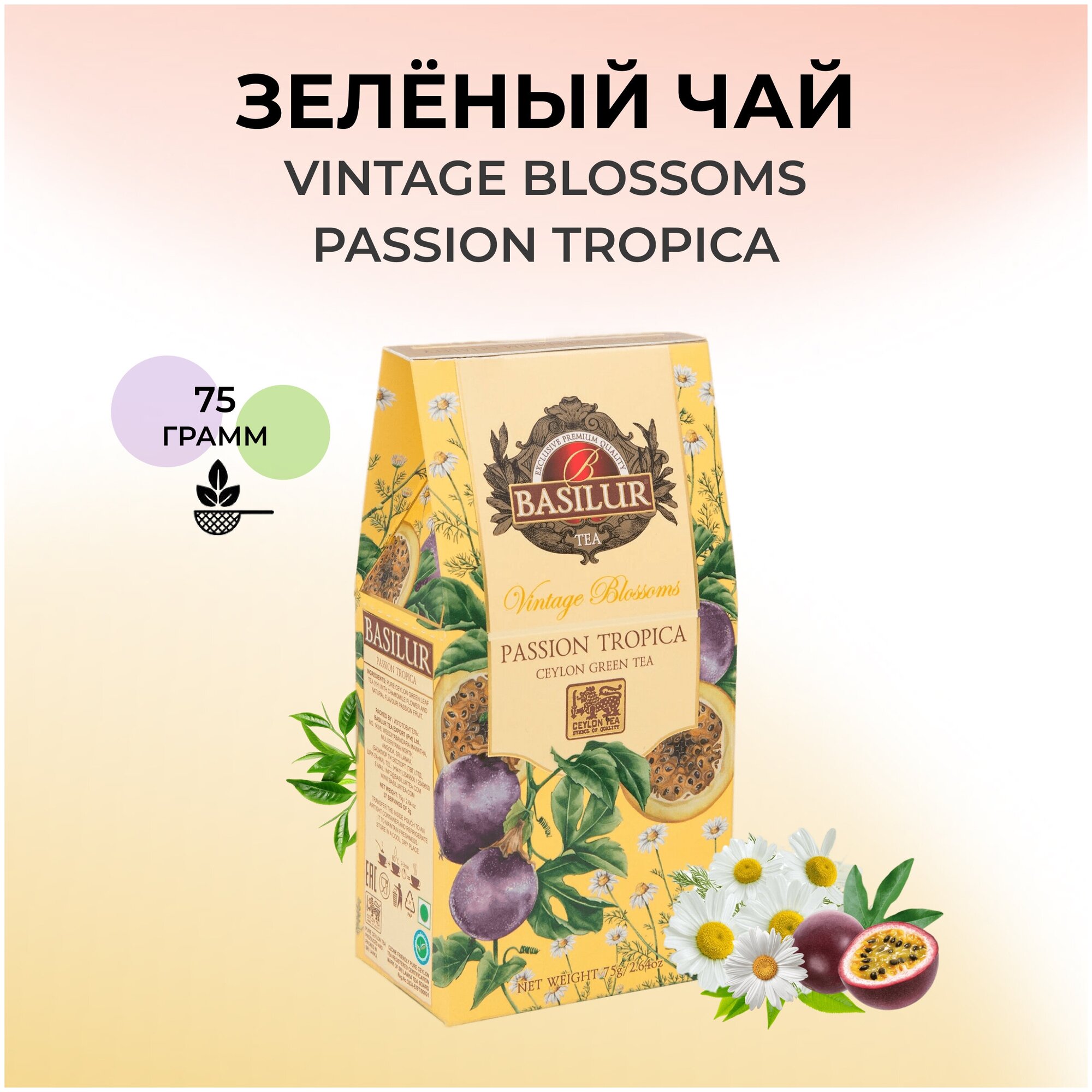 Чай Basilur винтажные цветы - тропическая страсть / PASSION TROPICA -75GЧай Basilur Винтажные цветы "Тропическая страсть" - изысканный зеленый цейлонский чай с нежным вкусом и ароматами маракуйи и ромашки. Маракуйя и ромашка содержат необходимые витамины и минералы для здоровья, что является исключительным сочетанием с антиоксидантными свойствами зеленого цейлонского чая. Идеален для здорового образа жизни. Состав: чай зеленый цейлонский байховый листовой, лепестки ромашки, натуральный ароматизатор маракуйи. Способ приготовления: заваривать 2-3 минуты горячей водой 80°C. Вес: 75 г. Тип упаковки: картонная. Размер: 8,5х5х17 см. Хранить в чистом, хорошо вентилируемом помещении без посторонних запахов при относительной влажности воздуха не более 70%. Страна производства: Шри-Ланка.