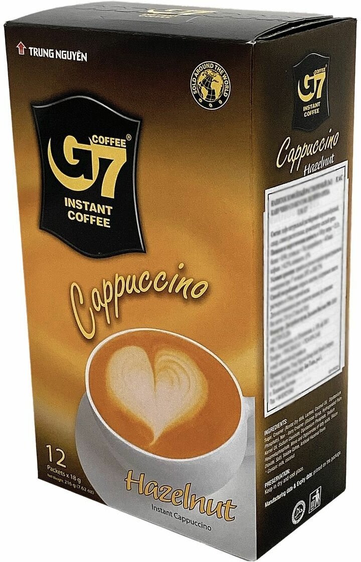 Trung Nguyen (G7) - это самый знаменитый бренд вьетнамского растворимого кофе, который с 2003 года поставляет свою продукцию в более чем 60 стран, а так же на самые крупные рынки Японии и Сингапура. Превосходный вьетнамский растворимый кофе 3 в 1 капучино с лесным орехом в пакетиках.