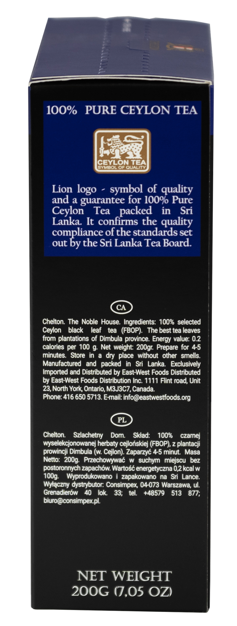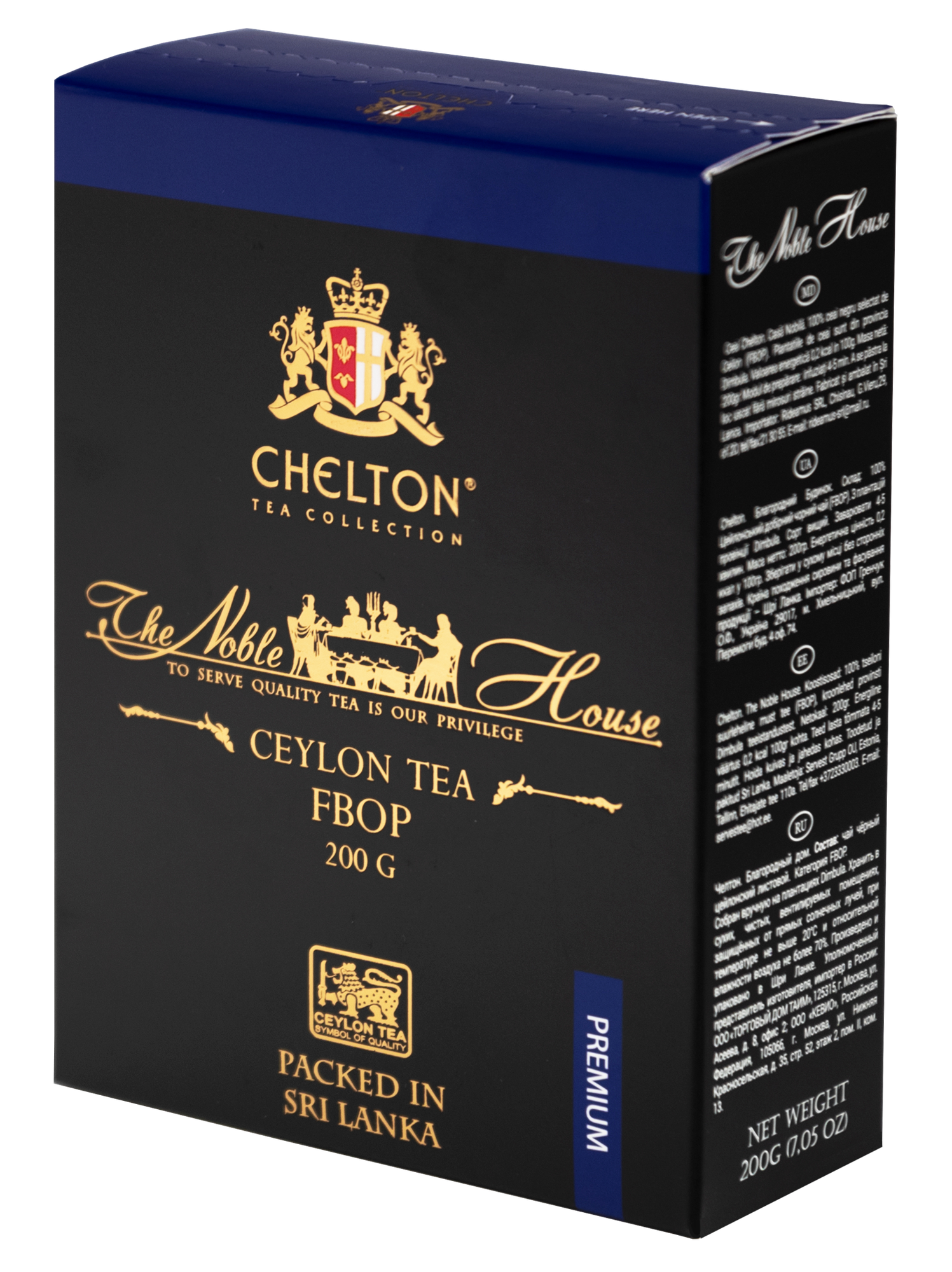 Чай черный листовой Chelton Благородный дом FBOP with Tips 100 г в картонной упаковке. Цейлонский черный листовой чай с типсами FBOP (Flowery Broken Orange Pekoe) собран вручную на плантациях острова Цейлон (Шри-Ланка). Черный чай с типсами обладает тонким гармоничным вкусом и волшебный ароматом. Типсы - молодые нераспустившиеся почки листа, несколько схожи с зеленым чаем, однако полезные вещества в них сосредоточены в гораздо больших количествах. Поэтому у напитка более высокий тонизирующий эффект и целебная сила. Логотип «Лев с мечом» на упаковке означает, что внутри 100% цейлонский чай, который был изготовлен и упакован на Шри-Ланке. При заваривании настой приобретает янтарный оттенок и насыщенный приятный аромат. Насладитесь чашечкой свежезаваренного чая в послеобеденное время, не забудьте любимый десерт и погрузитесь в мир гармонии и удовольствия с каждым глотком. Желаем вам приятного чаепития!