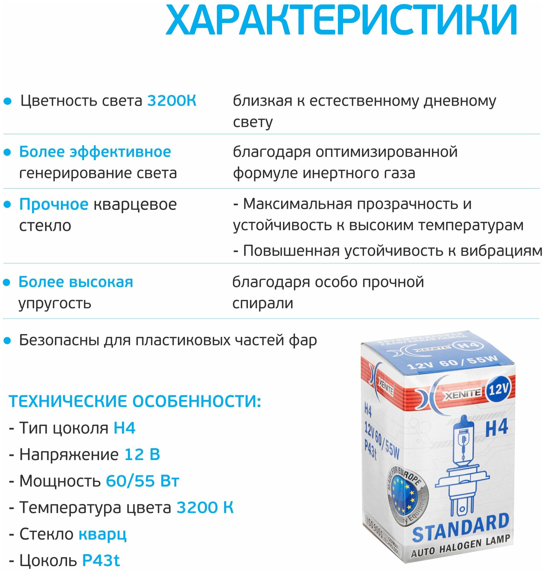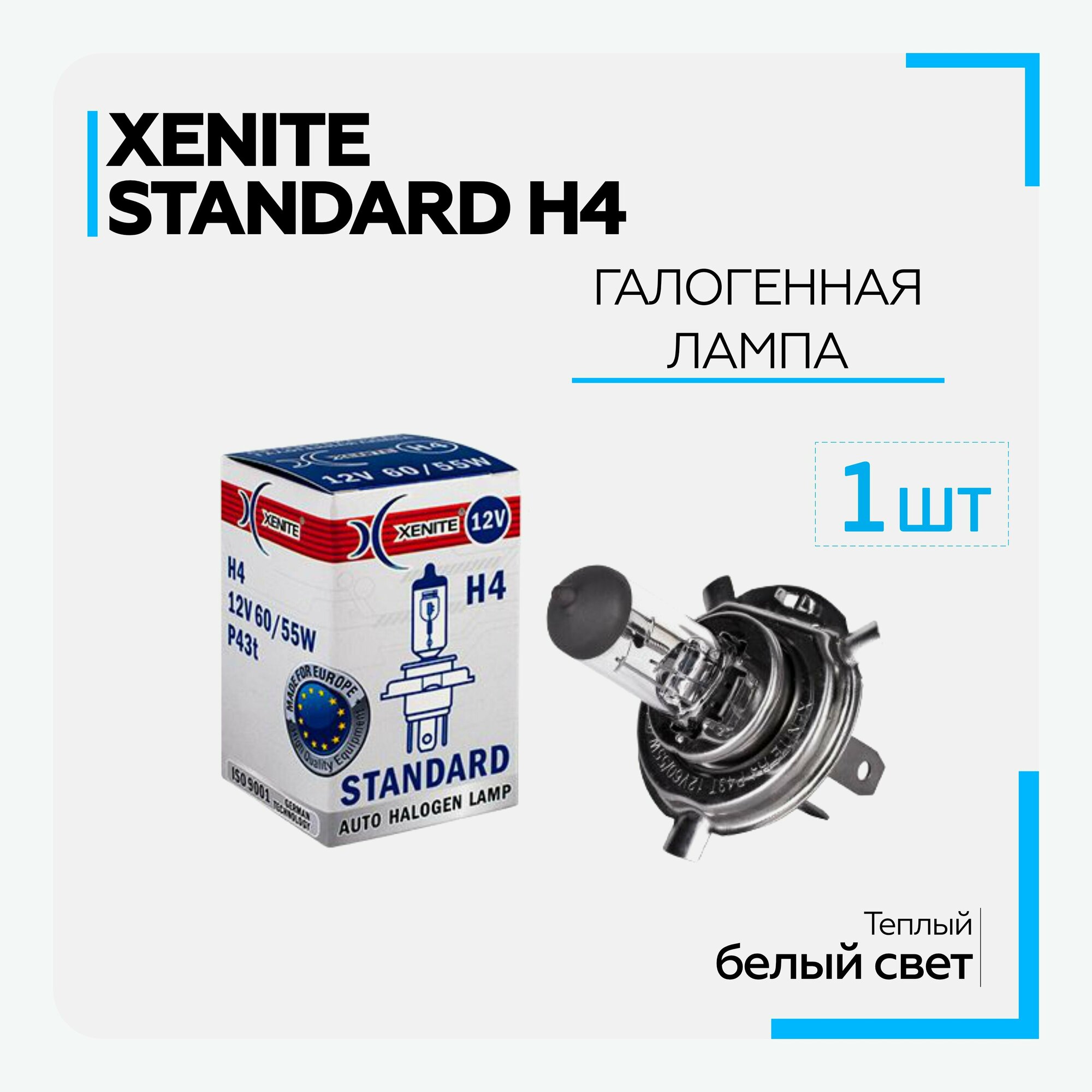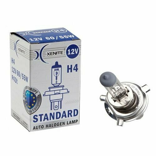 Автомобильная лампа XENITE STANDARD H4, P43t, 1 шт. имеет повышенную устойчивость к вибрациям. Идеально подойдет для установки в качестве головного освещения, ближнего и дальнего света. Точная геометрия нити накаливания дает ясное распределение светового пятна перед автомобилем, чтобы обеспечить максимальную безопасность и комфортное вождение для водителя.Используемое при производстве галогенных ламп Xenite кварцевое стекло с УФ-фильтром, обладает более высокой прочностью (по сравнению с тугоплавким стеклом), что позволяет выдерживать внутреннее высокое давление в колбе, обеспечить более мощный свет, повысить устойчивость к вибрациям и перепадам температур.