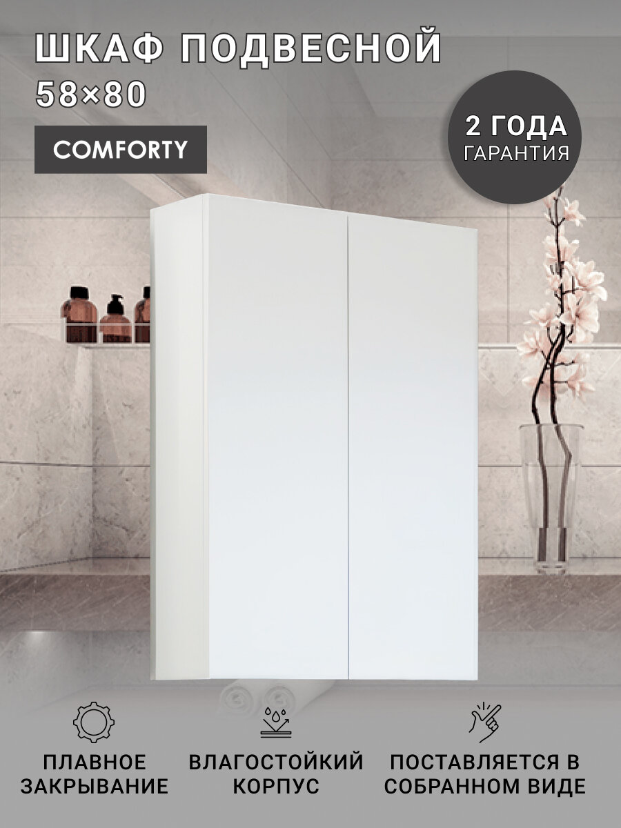Компания Comforty использует при производстве высококачественные водоотталкивающие материалы (ЛДСП), соответствующие всем необходимым требованиям безопасности. Коллекция Лозанна выполнена в эксклюзивном дизайнерском решении в лучших традициях. Белый, основной цвет исполнения Comforty Лозанна, отлично подходящий большинству дизайнерских решений. Шкаф предусматривает удобную и вместительную систему хранения, состоящую из дверей. Качественные доводчики позволяют обеспечить мягкое и тихое закрывание. Важные габариты изделия: ширина 58 см, глубина 18 см, высота 80 см.