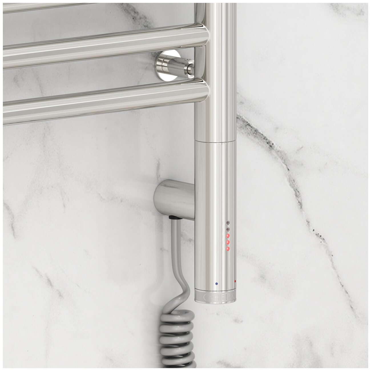 Богема 3.0 - электрический полотенцесушитель из нержавеющей стали, оснащённый многофункциональным блоком управления МЭМ Сунержа. Преимущество жидкостных моделей в том, что они обладают повышенной мощностью (до 300 Вт) и могут служить не только для сушки вещей, но и как полноценный прибор для обогрева большого помещения. МЭМ в этих моделях сконструирован так, что при достижении заданной температуры он отключается и по мере остывания включается и нагревается вновь. Благодаря такому режиму работы модуль помогает беречь электроэнергию. Режимы работы МЭМ - Поверните элемент управления, чтобы модуль начал работу - Каждый следующий поворот задаёт комфортную для вас температуру - Красные светодиоды не мигают и загораются по очереди в зависимости от заданного уровня температуры. - Если продолжить крутить поворотный элемент модуля, то модуль переходит в режим таймера. В этом случае температура остаётся неизменной на уровне 60 °C. - Каждый поворот задаёт время, в течение которого прибор будет беспрерывно работать, вплоть до пяти часов включительно. - Мигающие красные светодиоды оповестят вас о количестве часов, которое осталось до автоматического выключения прибора.