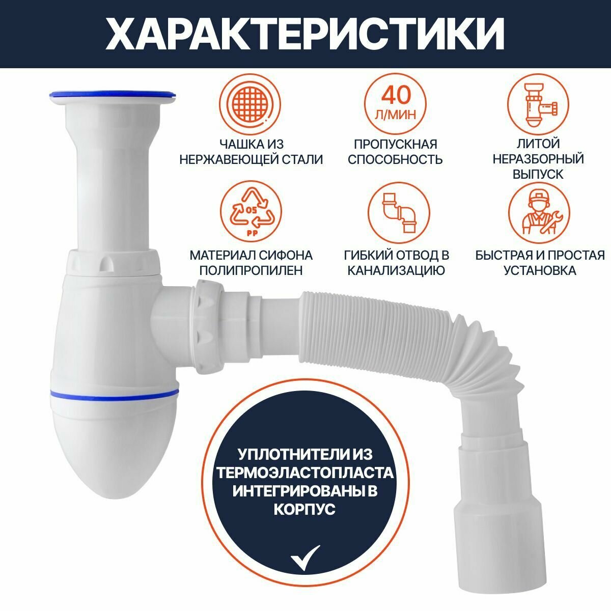 Сифон прост в установке и выполняет свою главную функцию - формирование гидрозатвора для отсечения неприятных запахов из канализации.