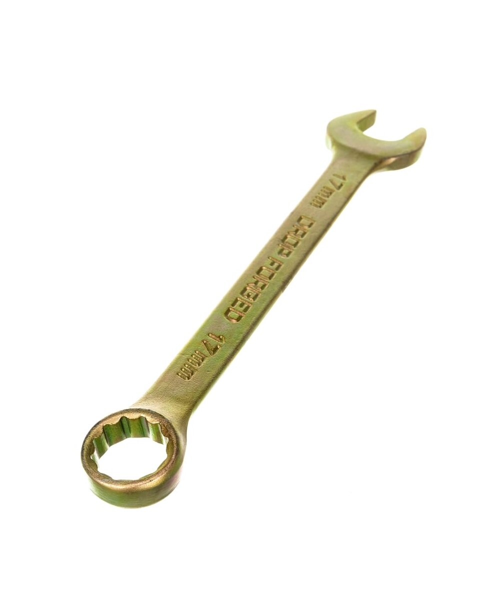 Комбинированный ключ 17 мм СИБРТЕХ выполнен из прочной углеродистой стали и имеет высокую твердость рабочих частей. Подходит для частого использования при выполнении крепежных работ с резьбовыми соединениями. Желтое цинковое покрытие надежно защищает ключ от появления коррозии, благодаря чему срок службы инструмента увеличен.