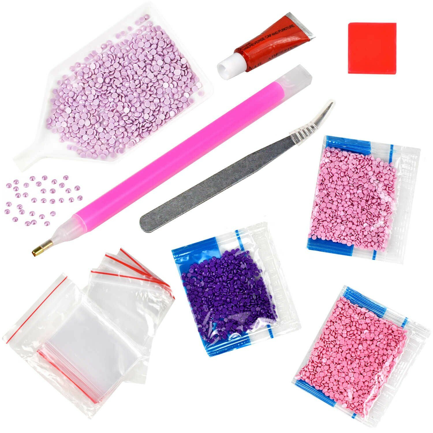 В наборе: 20 цветов страз, холст с напечатанной картиной, покрытый клеевым слоем и защитной пленкой, пакеты со стразами, лоток для страз, стилус, силикон для страз, клей, пинцет металлический, схема, дополнительные пакеты с zip-молнией в комплекте
