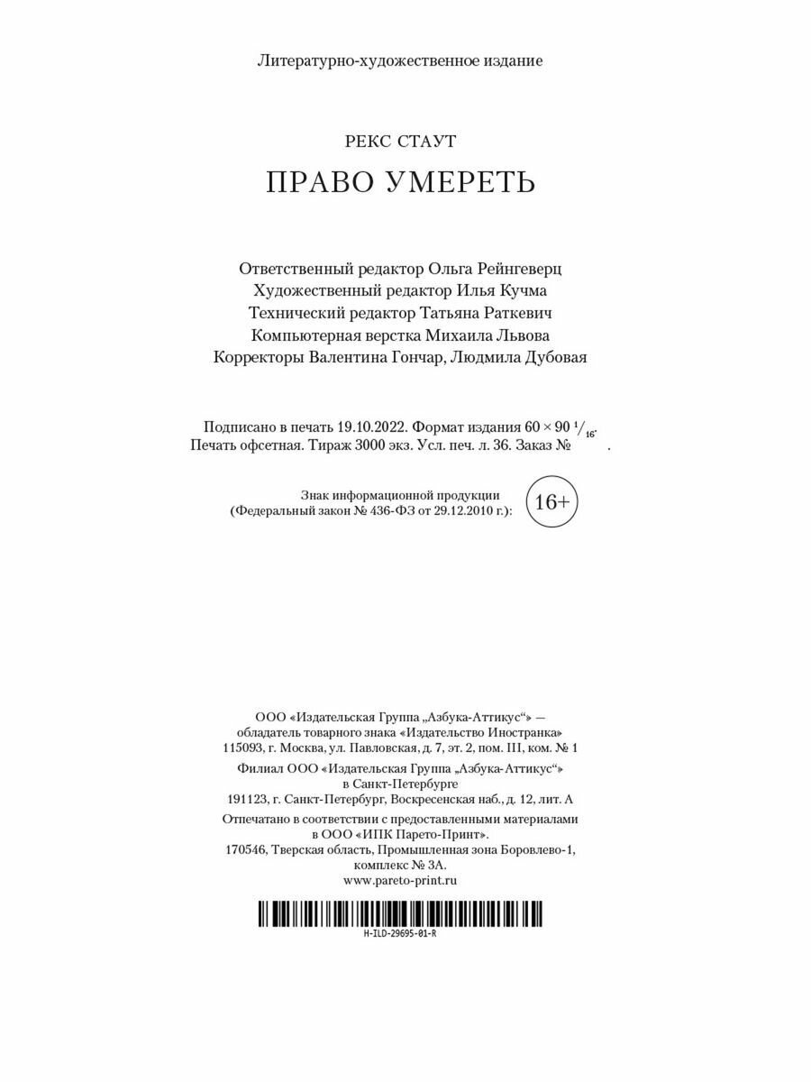 Книга: Право умереть романы (Стаут Рекс Тодхантер); Иностранка, 2023