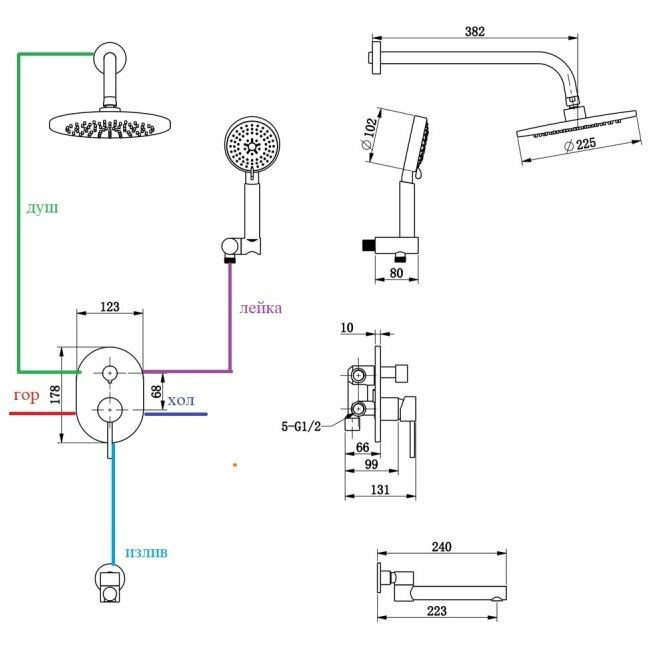 | Комплект поставки | смеситель для душа; верхний душ; ручной душ; шланг для ручного душа; набор для подключения; держатель для душа; излив |