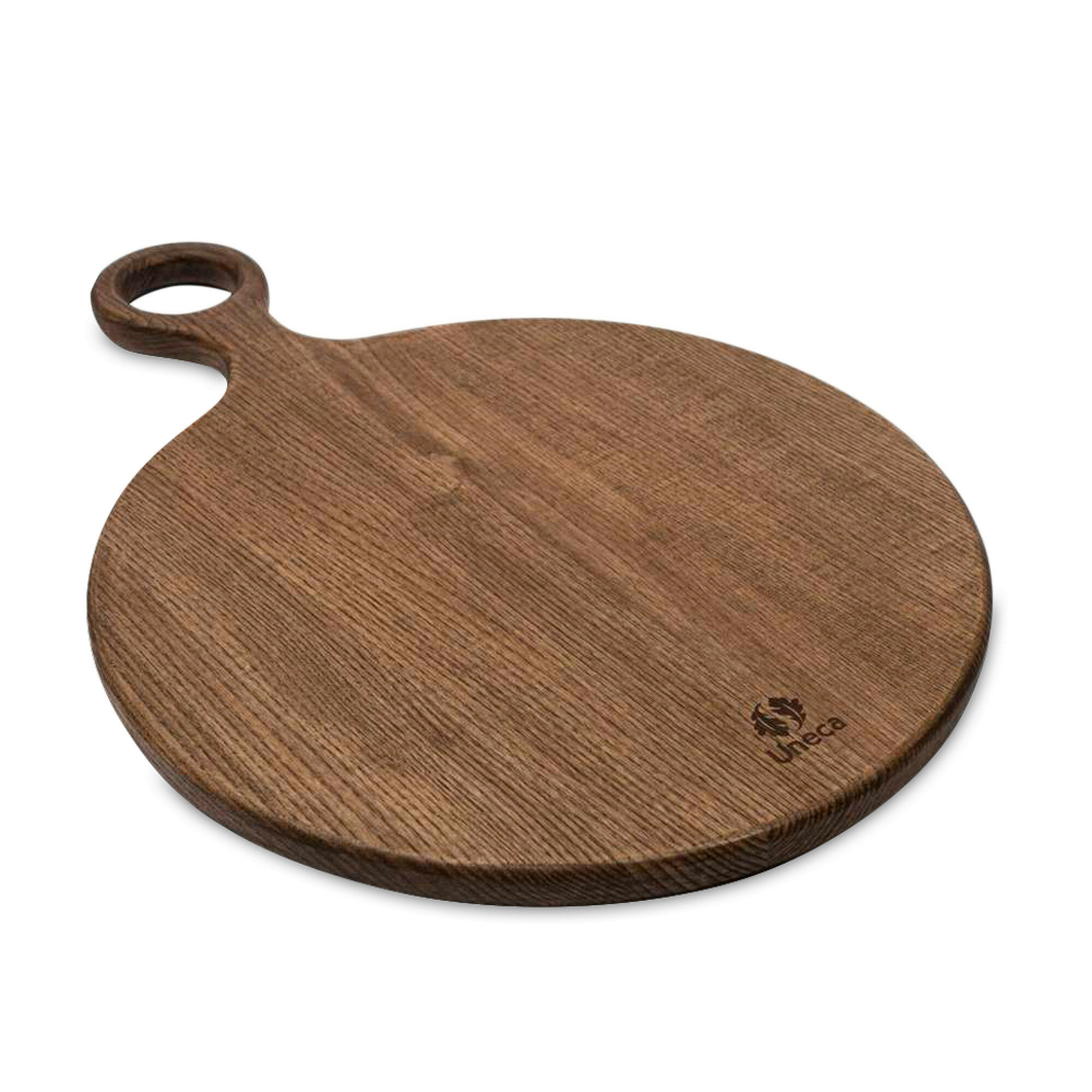 Разделочная доска с ручкой Uneca: функциональность и стильРазделочная доска Uneca изготовлена из дуба, что гарантирует ее прочность и долговечность.Темно-коричневый цвет доски придает ей элегантный и стильный вид, который будет гармонично смотреться на любой кухне.Круглая форма доски обеспечивает удобство при работе с ней, а также позволяет использовать ее для нарезки различных продуктов.Наличие ручки на доске делает ее удобной для использования и хранения.Выбирая разделочную доску Uneca, вы получаете качественный и стильный аксессуар для вашей кухни, который прослужит вам долгие годы.