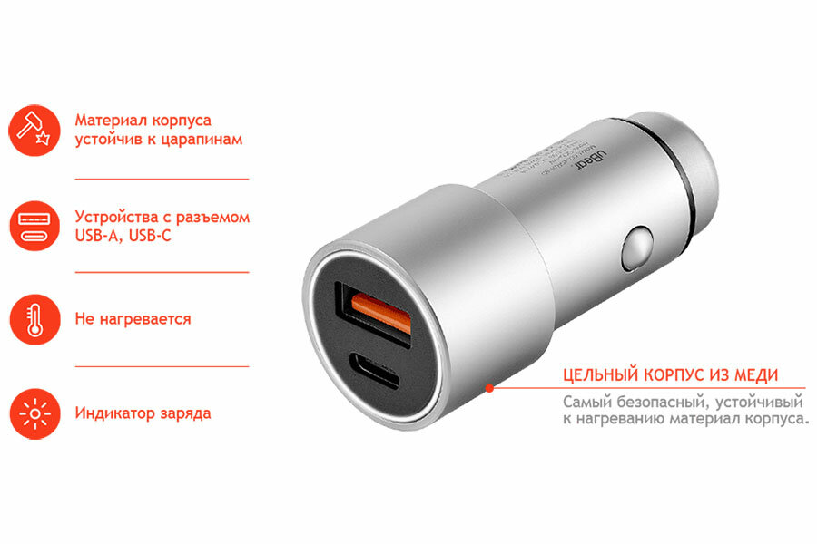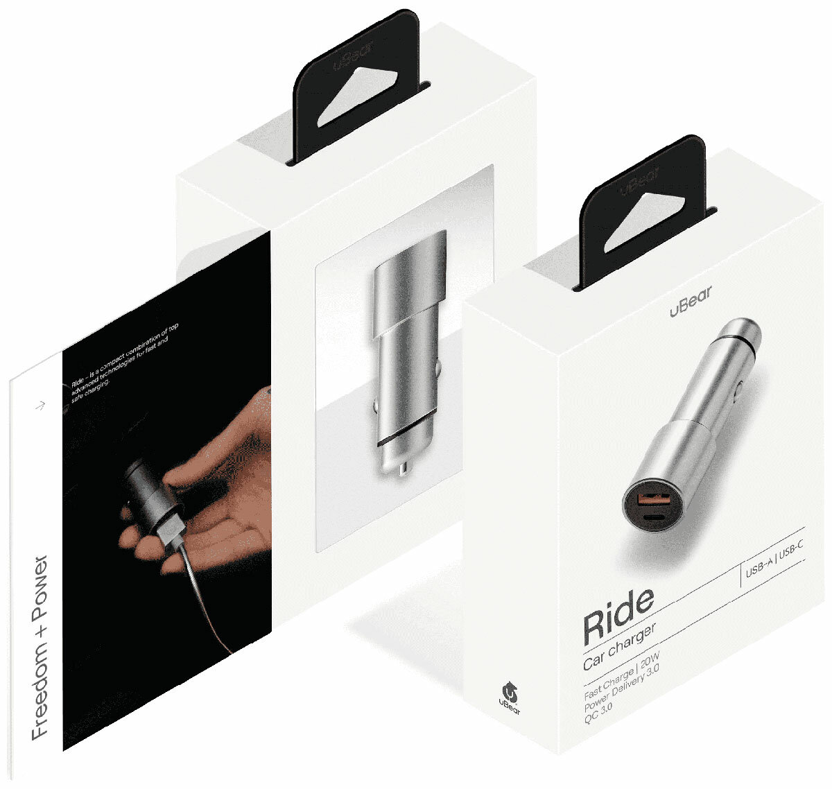 uBear RIDE USB-A | USB-C - это компактное зарядное устройство для автомобиля, в котором объединены новейшие технологии для высокоскоростной зарядки, что позволит в 3 раза быстрее заряжать Ваши девайсы. Медный корпус делают эту зарядку по настоящему премиальным аксессуаром в Вашем автомобиле. Быстрая зарядка. Теперь в 3 раза быстрее Благодаря передовым стандартам зарядки USB Power Delievery (PD) и Quick Charge 3.0 Вы можете заряжать сразу два устройства одновременно на мощности до 20 ВТ. Инетеллектуальная система управления зарядом обеспечит выбор максимальной скорости зарядка для каждого устройства. 2 в 1 В автомобильном зарядном устройстве RIDE предусмотрено 2 порта (USB-A, USB-C). Вы сможете заряжать одновременно два устройства на максимальной скорости. Безопасность RIDE — продвинутое зарядное устройство с максимальной защитой. Встроенный датчик температуры предотвращает перегрев устройства. Защита от перегрузки и перенапряжения - дают дополнительную надежность . RIDE обеспечивает Вам полную безопасность — самое ценное, что может быть в дороге. «Умный» LED-индикатор покажет состояние зарядки.Корпус из меди. Премиальный аксессуар Корпус из меди не только выглядит премиально, что существенно выделяет данное зарядное устройства от большинства на рынке, но и имеет два функциональных преимущества: отлично отводит тепло, предотвращая перегрев внутри устройства, а также не оставляет на себе отпечатков пальцев.