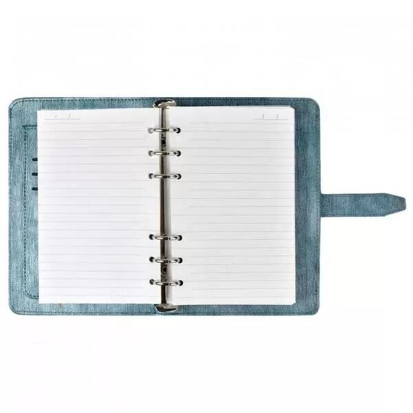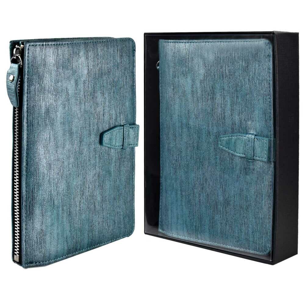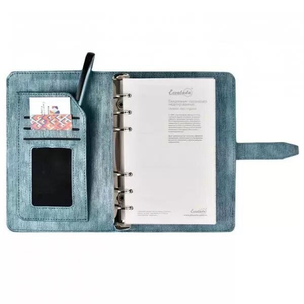 Ежедневник-органайзер недатированный на кольцах Феникс+ «Павлин голубой» имеет твердый переплет с поролоном, дополнительное отделение-портмоне на металлической молнии как часть обложки, застежка «клапан в петле», блинтовое тиснение, закругленные углы переплета, прямые углы внутреннего блока, обстрочка обложки по периметру нитками в цвет переплетного материала, кольцевой механизм на шесть колец, дополнительные карманы для документов и визиток. Индивидуальная упаковка: оберточная бумага черного цвета, картонная коробка из дизайнерской бумаги черного цвета, ПЭТ-упаковка.