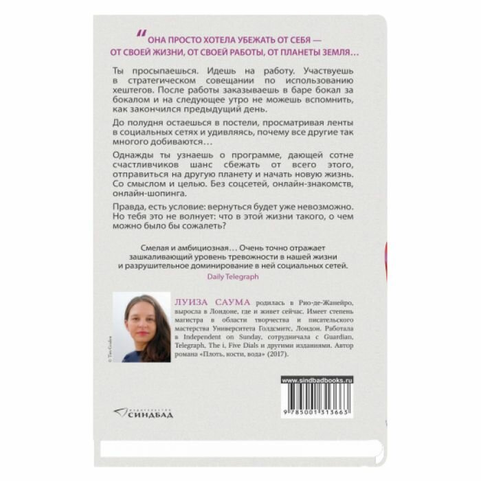 А ежели подробно, то книжка про девушку, которая занимается разработкой цифровых стратегий для брендов в рекламном агентстве, регулярно прибухивает из-за бессмысленности бытия и отчаянно пытается лавировать между детскими травмами. И настолько ей всё это становится невмоготу, что она уходит добровольцем в эксперимент. Сотня энтузиастов навсегда прощается со всем земным, включая родных и социальные сети, и отправляется на другую планету с билетом в один конец. Строить новую и, естественно, счастливую жизнь в условиях, максимально приближенных к инкубаторским. С Земли за ними – вот же сюрприз! – наблюдают в формате реалити-шоу.