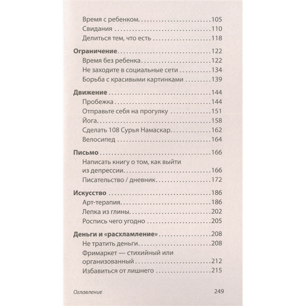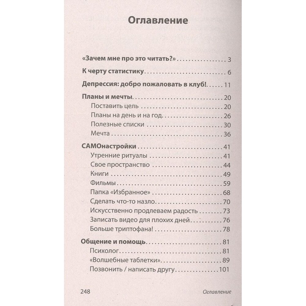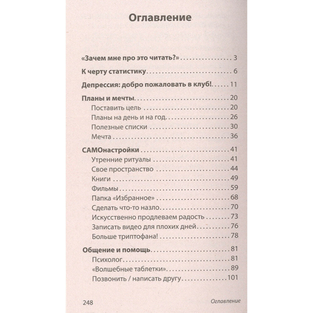 Замысел автора - побудить вас прислушаться к своему внутреннему голосу, довериться ему и, оттолкнувшись от предложенных техник, придумать и воплотить свои. Выберите что-то, что будет вам по душе. А потом придумайте свои методы и будете сам себе антидепрессант!