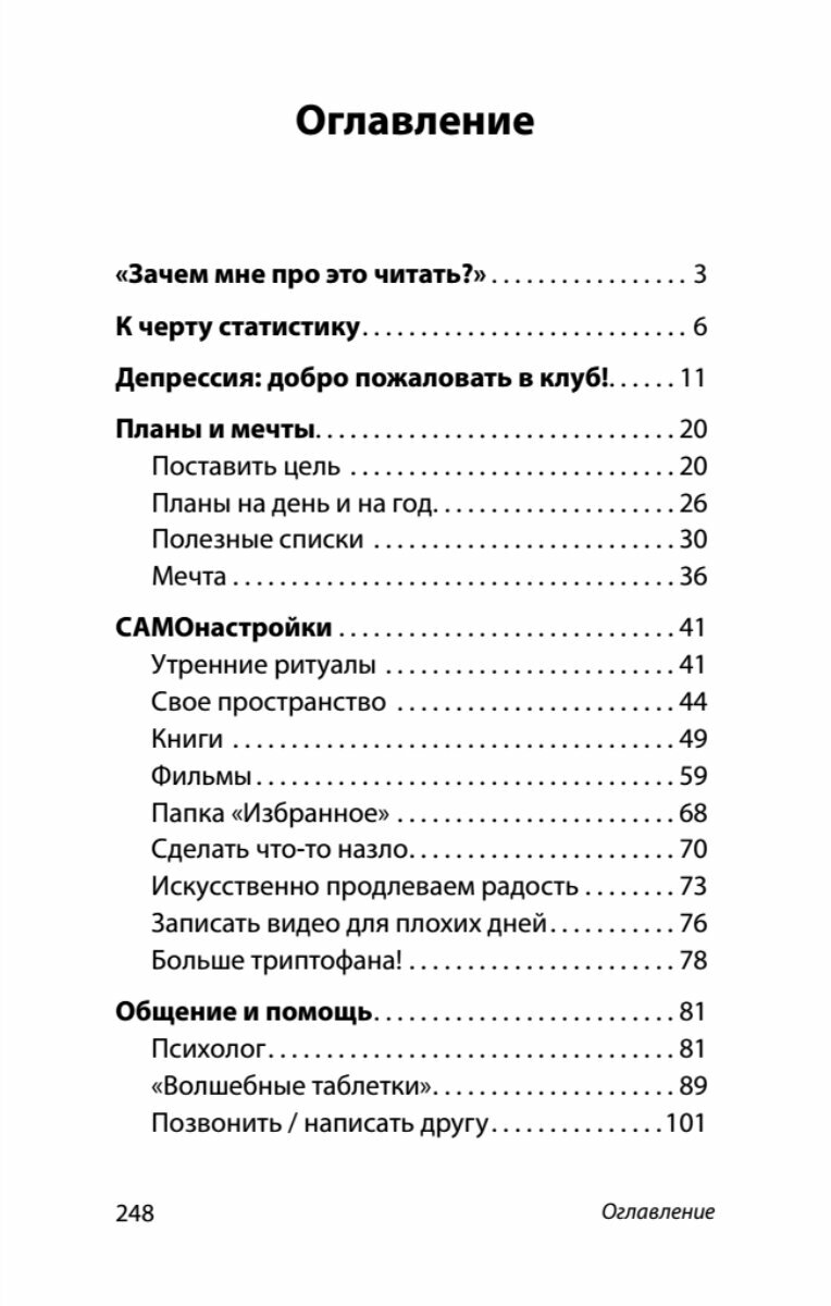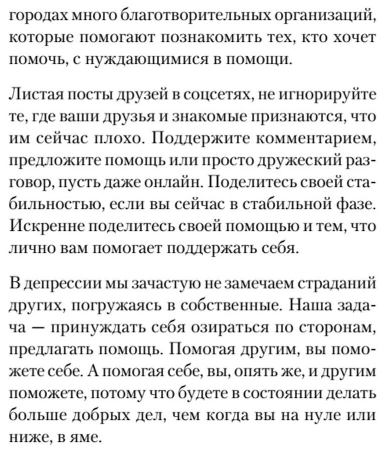Первое, что, на мой взгляд, действительно очень важно упомянуть в самом начале, - это то, что автор не является психологом, психиатром и вообще никогда не получал медицинского образования, только помощь. Автор рассказывает свою личную историю депрессии и диагноза "тревожно-депрессивное расстройство", приема антидепрессантов и путь выздоровления. Послушать человека с похожими проблемами всегда полезно, даже раковых больных курируют люди с таким же диагнозом, либо уже выздоровевшие, они не врачи, как и не врачи сидят в группах поддержки. Но это то, что надо знать заранее, чтобы понимать, с кем вы "разговариваете". А вообще, воспринимать эту книгу именно как группу поддержки, будет правильно и полезно. Это место, где вы говорите об одном и том же и понимаете друг друга, где вы обращаетесь к одному и тому же вопросу, но по-разному, и это "по-разному" и может дать вам новые силы, новые идеи и новые инструменты. Автор будет говорить с вами на тему времяпрепровождения, полезных книг, подходящих продуктов питания, обустройства личного пространства, общения с близкими, все эти базовые жизненные вещи будут обсуждаться с целью выстроить их так, чтобы они несли в себе помощь, стали инструментом к победе. Книга уникальна за счет своего автора, а точнее его истории и отсутствия медицинского статуса, одновременно это тот момент, о котором вам нужно будет поразмышлять прежде чем приниматься к чтению.