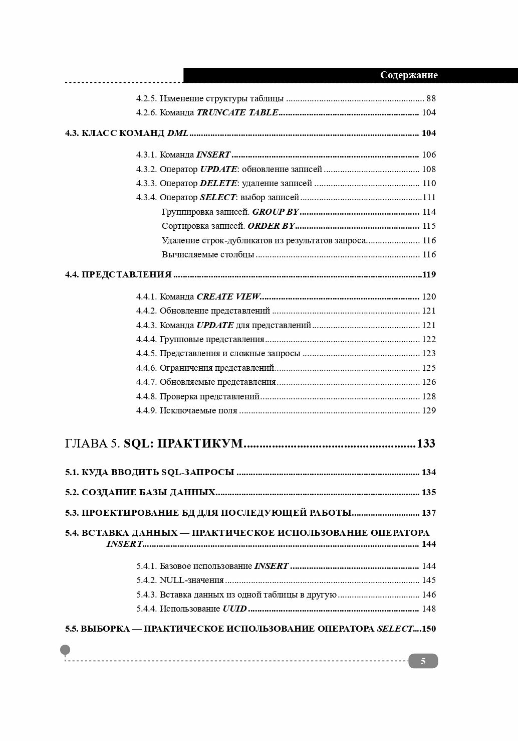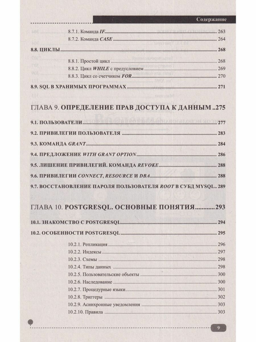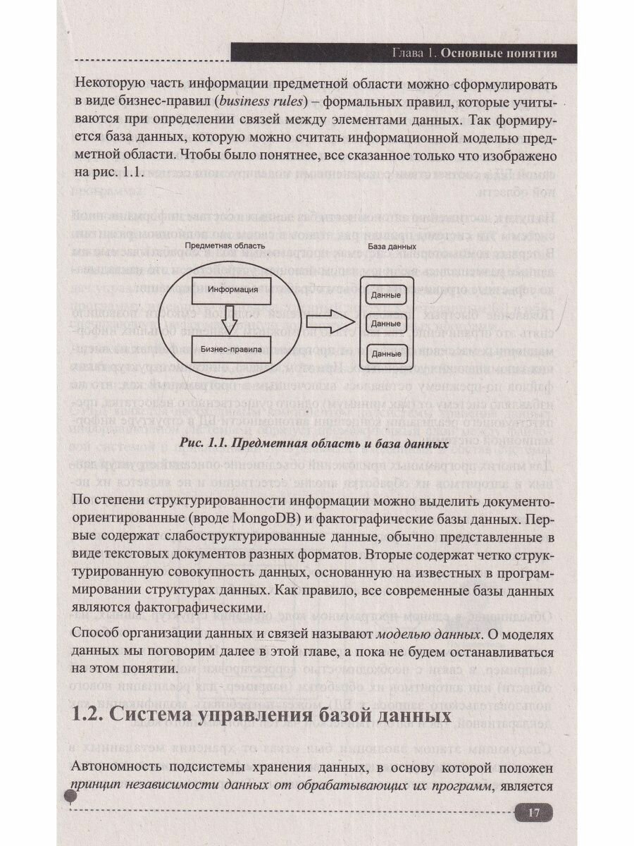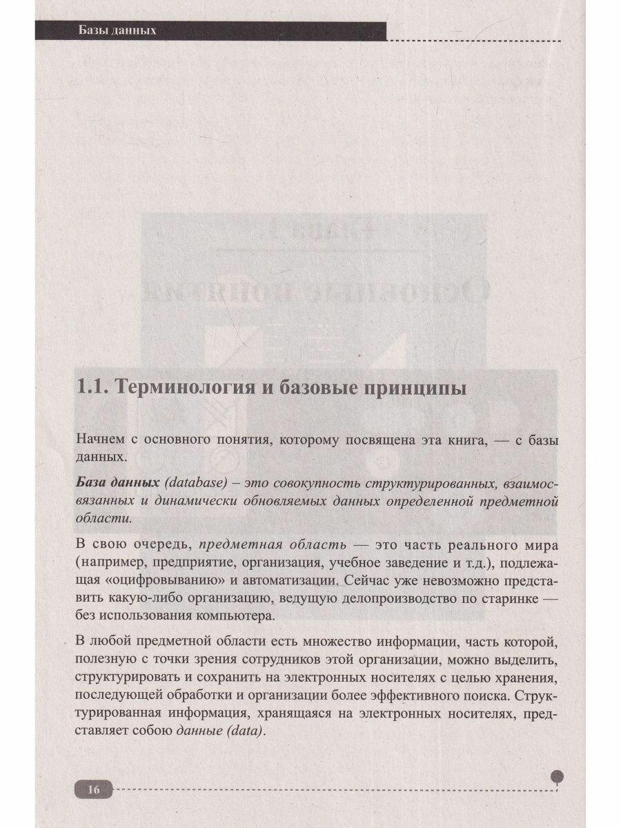 В этой книге рассматриваются только реляционные базы данных. Мы постарались собрать в одной книге множество самых различных тем для работы с базами данных: вы узнаете об устройстве баз данных; проектировании, индексах и транзакциях в работе с БД; о синтаксисе SQL (вместе со множеством примеров), а также PL/SQL; поговорим об определении прав доступа к данным и многом другом. Отдельное внимание уделено практическим особенностям и реализации наиболее распространенных реляционных СУБД: MySQL, Oracle и PostgreSQL. Книга рассчитана на начинающих и уже состоявшихся пользователей баз данных, системных администраторов, разработчиков ПО, которым приходится работать с СУБД.