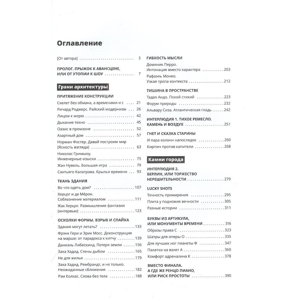 Отличная книга для новичка и любителя. Книга состоит из обзора творчества некоторых авторов последних лет 50-ти. На кого-то отведено больше (Ричард Роджерс), на кого-то меньше (хотелось бы больше про Заха Хадид). Имеются описания к подходу строительства некоторых зданий, их актуальность. Автор дает свою оценку построенному в т.ч.проблематику современной стройки в России. Понравилось описание застройки в Хельсинки и обновление квартала в Таллине. В книге много цветных фото. Минусом для меня в такой книге отсутствие в конце алфавитного указателя :)