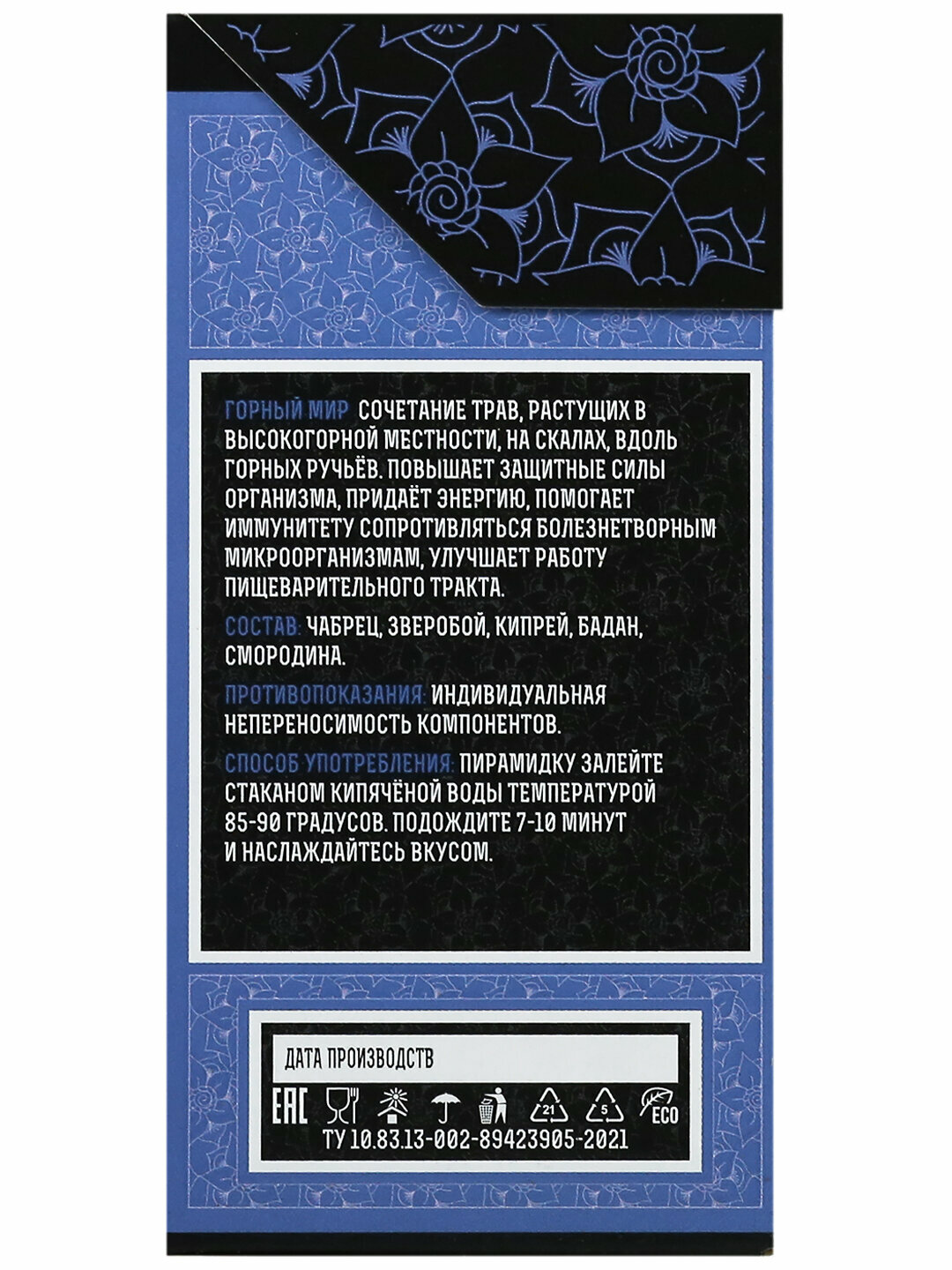 | Способ приготовления | Пирамидку залейте стаканом кипячёной воды температурой 85-90 градусов. Подождите 7-10 минут и наслаждайтесь вкусом. |