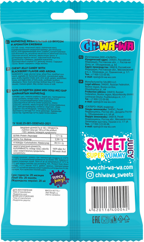 | Состав | Сахар, глюкозный сироп, пшеничная мука, модифицированный кукурузный крахмал, растительное масло, влагоудерживающий агент (сорбит), концентрированный яблочный сок, регулятор кислотности (яблочная кислота, лимонная кислота), желатин, эмульгаторы (моно- и диглицериды жирных кислот, подсолнечный лецитин), ароматизатор Ежевика, пищевые красители (бриллиантовый голубой FCF, диоксид титана). |