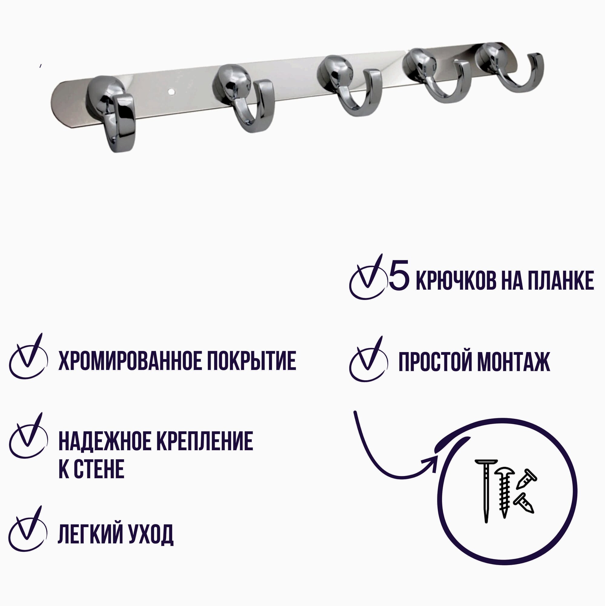 Крючок на планке четверной хорошо подойдет для ванной комнаты, гардеробной, прихожей или для хранения на кухне. Также для одежды, полотенец, мочалок, украшений, инструментов. Крючок на планке удобно крепится на саморезы к любой поверхности.Материал изделия: цинк, нержавеющая сталь.Размер: 29 х 3 х 5 см.