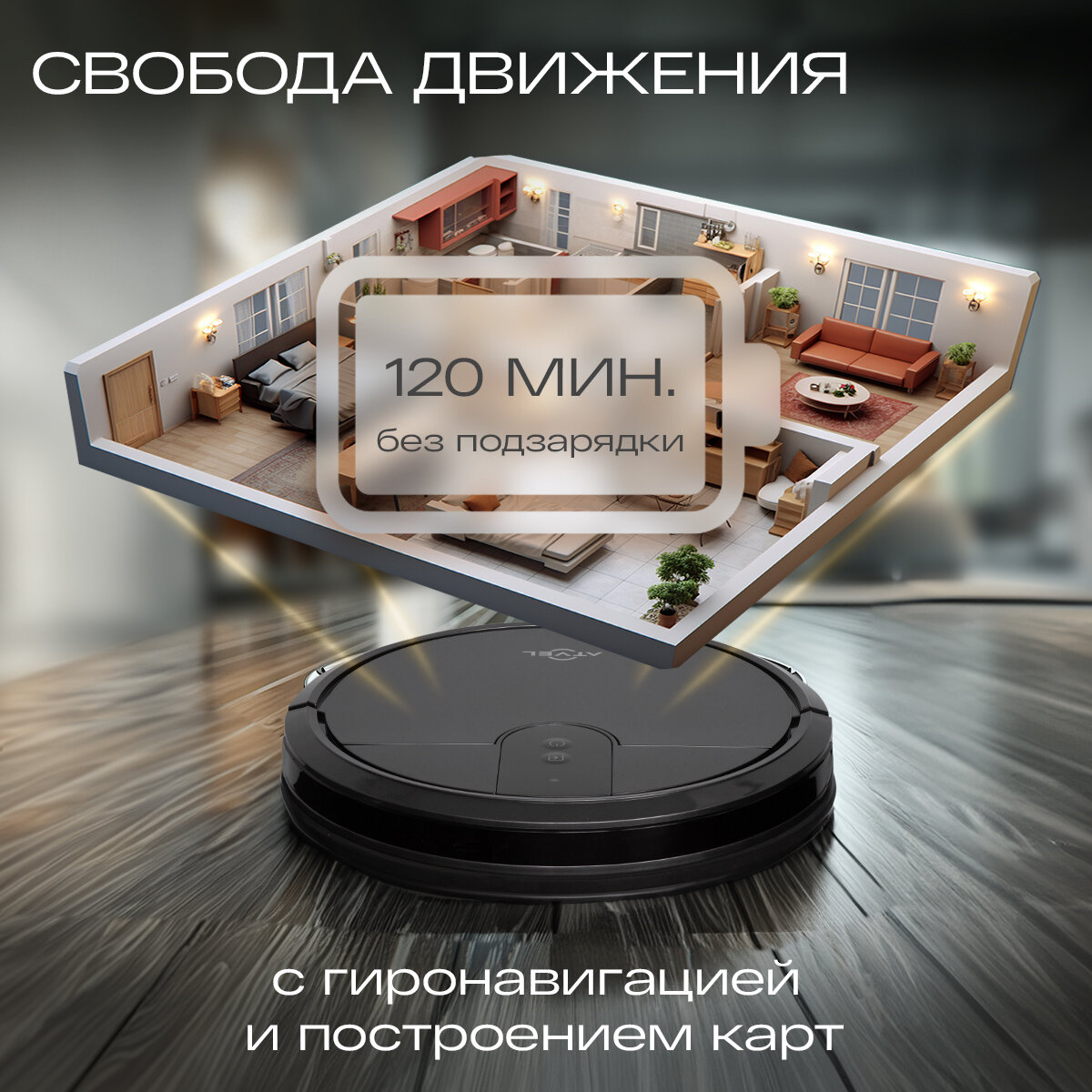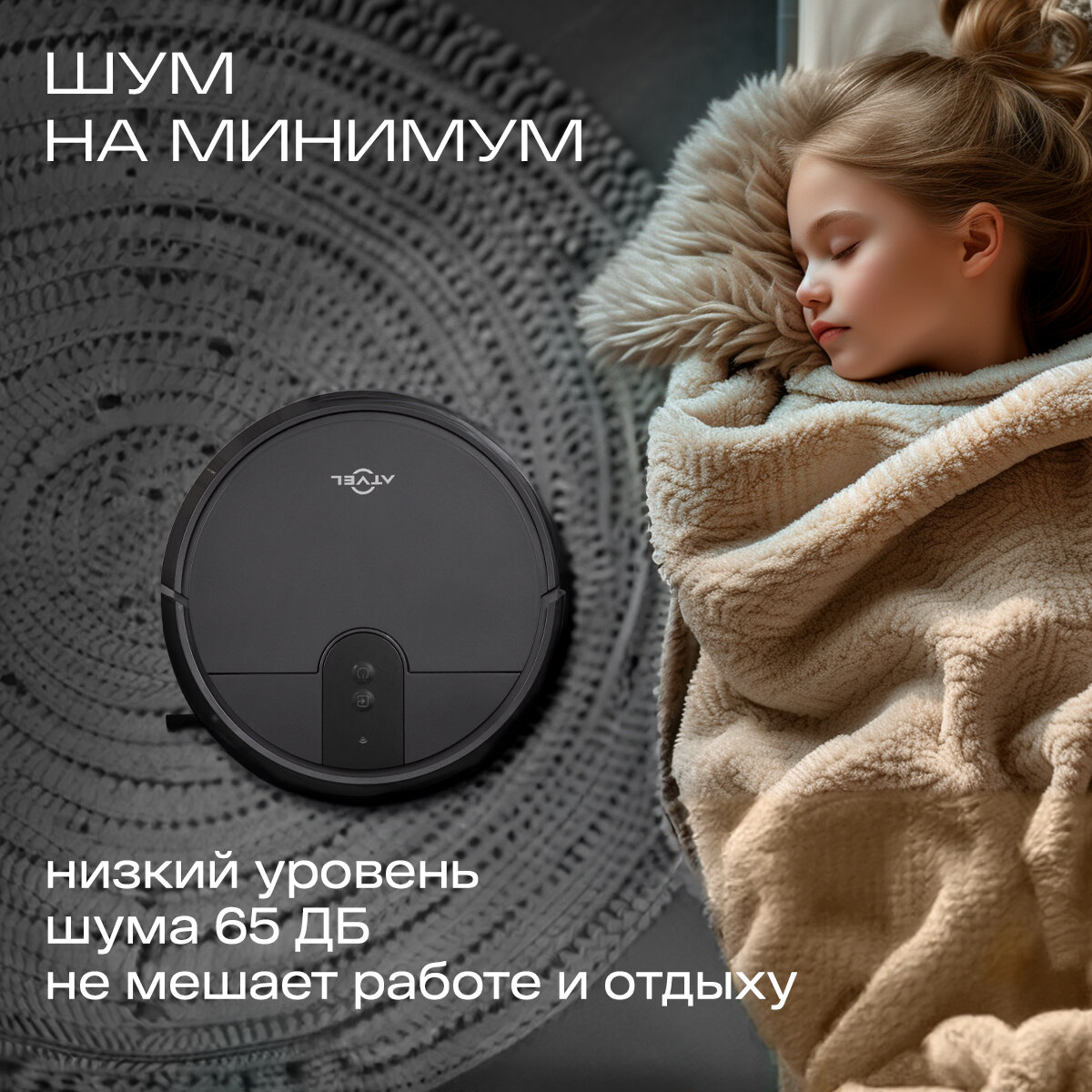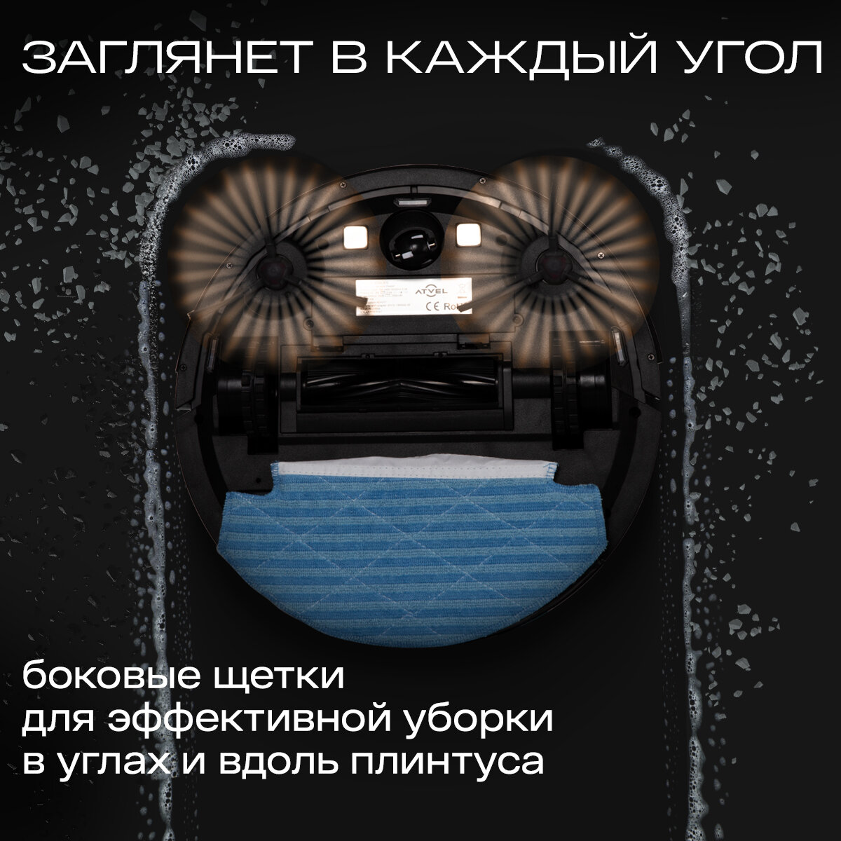 Робот пылесос Atvel обладает современной системой гиронавигации, которая не уступает лазерной в точности. Идеальная гиронавигация. Пылесос снабжен 9-осевым гиромодулем, который позволяет ему ориентироваться в квартире, запоминать расположение базы и уже убранных участков. Благодаря точной навигации робот обходит всю доступную площадь без пропусков и за минимальное время. Дополнительные 13 датчиков сближения, касания и перепада высот помогают лучше ориентироваться в помещении и быть аккуратным с элементами интерьера. Мобильное приложение Приложение позволяет управлять роботом из любого места, где есть Интернет. Пороги Высота преодолеваемого порога 15 мм. Сухая и влажная уборка Благодаря мусоросборнику и контейнеру для воды робот может проводить сухую и влажную уборку одновременно. Интеллектуальная система подачи воды В отличие от моделей с обычным водным резервуаром Atvel имеет насос и программируемый контроллер расхода, что позволяет регулировать влажность салфеток, исключить появление луж и протекания на зарядной базе. Полноценная уборка с HEPA Комбинированная уборка увлажняет воздух, а HEPA-фильтрация избавляет его от аллергенов и мелкой пыли. Мощный вакуум Высокая сила всасывания 2200 Па обеспечивает качественную уборку мусора. Уборка под мебелью. Тонкий корпус высотой всего 7,8 см позволяет уверенно проходить под мебелью не ниже 8 см. Интеллектуальные сенсоры. Благодаря 12 парам различных сенсоров робот действует чётко и аккуратно: не врезается в предметы интерьера и всегда возвращается на базу.
