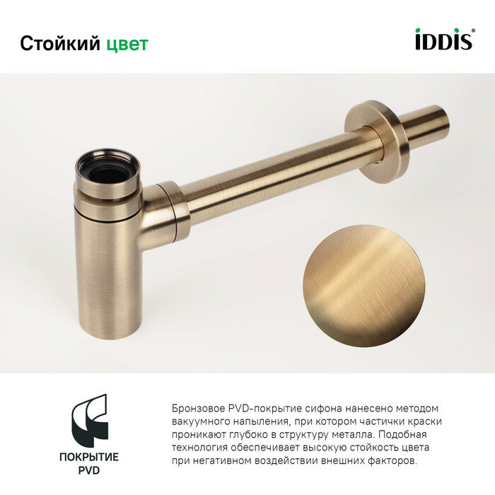 Сифон Optima Home – стильное решение для современной ванной. Модель в бронзовом цвете гармонично сочетается со смесителями в тон, помогая создать доступное пространство для комфортной жизни. Гидрозатвор в сифоне защитит ванную от неприятных запахов из канализационной системы. Бутылочный сифон Optima Home легко разобрать при необходимости. Что невероятно удобно для поиска утерянных ценностей и быстрого удаления засоров.• Монтаж сифона прост и удобен: высота вывода канализации и высота установки умывальника могут быть отрегулированы в пределах 40-100 мм.• Сифон IDDIS® прослужит долго благодаря надежному корпусу из прочной латуни, стойкому к коррозии, резким изменениям давления и перепадам температуры воды.• Бронзовое PVD-покрытие сифона нанесено методом вакуумного напыления, при котором частички краски проникают глубоко в структуру металла. Подобная технология обеспечивает высокую стойкость цвета при негативном воздействии внешних факторов.• Гарантия на сифоны IDDIS® – 5 лет.