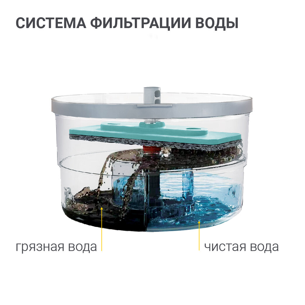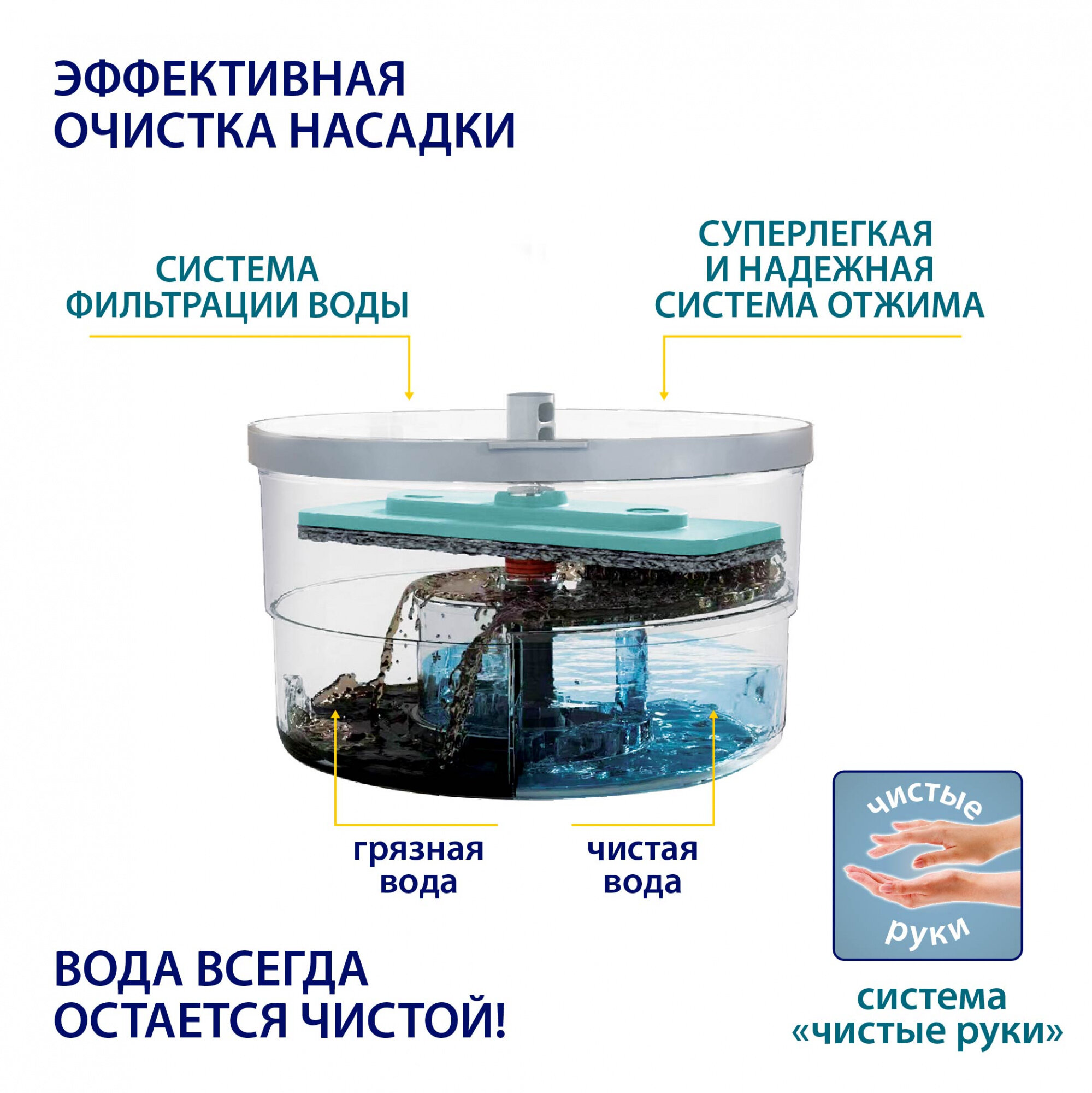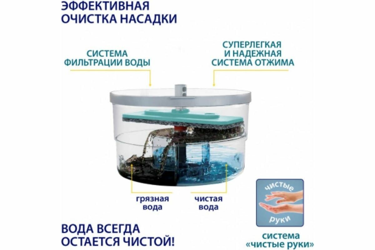 | Особенности | Оснащен системой отжима насадки с уникальной функцией фильтрации воды - отделения / сепарации грязной воды, а также опцией индикации полоскания / отжима |