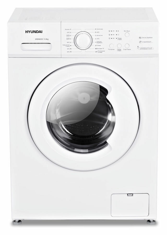 Стиральная машина Hyundai WMA6002 белый корпус, белый люк, фронтальная загрузка до 5кг, максимальная скорость отжима 1000об/мин, класс энергопотребления A++