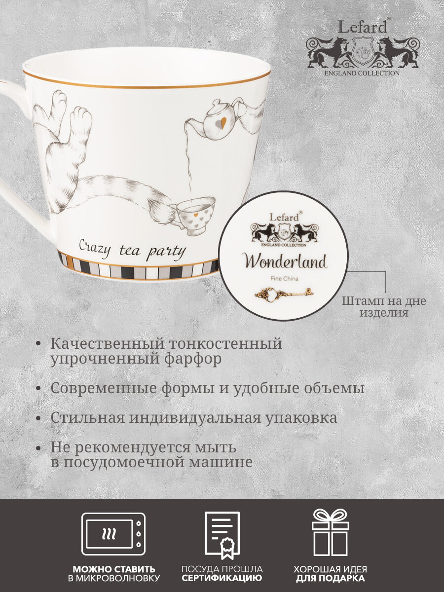 ТМ LEFARD эксклюзивная коллекция «WONDERLAND», созданная по мотивам литературных произведений в стиле фэнтези, на которых воспитывалось не одно поколение детей и выросших взрослых. Удивительную историю девочки, встретившей говорящего Белого Кролика и загадочного Чеширского Кота знает практически каждый на планете. В жизни возможно все, надо лишь в это поверить. Широкий ассортимент тарелок, салатников, кружек, чайных пар поможет организовать «волшебное» чаепитие. Все изделия выполнены из качественного тонкого фарфора. Прямые современные формы, удобные объемы. Стильная, подарочная упаковка. Дарите сказку друзьям и близким людям!Нельзя мыть в посудомоечной машине, можно использовать в микроволновой печи.