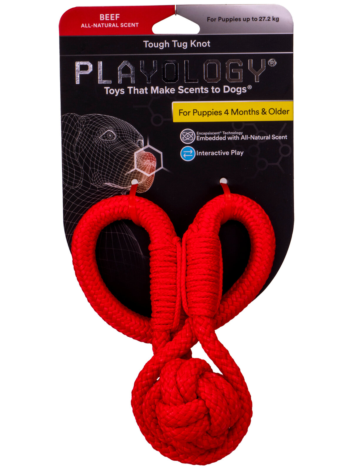 Playology Игрушка для щенковPlayology жевательный канат TOUGH TUG KNOT для щенков 4-8 месяцев с ароматом говядины, цвет красныйPlayology ® разрабатывает ароматизированные игрушки, изготовленные из безопасных для собак материалов, которые занимают собаку в 7 раз дольше, чем игрушка без запаха. В основу каждой игрушки заложена технология «вживленного аромата» (ENCAPSISCENT®), ароматизированные частицы по запатентованной формуле буквально внедрены на микроскопическом уровне в прочный материал игрушек, будь то резина или текстиль, что делает их абсолютно уникальными и долго сохраняющими аромат. Канат Tough Tug Knot изготовлен по технологии формованного волокна, предотвращающей разрыв веревки на длинные куски, которые могут быть опасны для вашего питомца при проглатывании. Конструкция каната с узелками идеально подходит для щенков и помогает в развитии. Подходит для щенков 4-8 месяцев (весом до 27,2 кг) в период прорезывания зубов для интерактивных игр. Обратите внимание: нет неразрушимых игрушек, любую игрушку следует регулярно осматривать и забирать, если игрушка повреждена, чтобы исключить травмирование питомца. Убедитесь, что выбранная вами игрушка подходит по размеру и темпераменту вашей собаки. Не подлежит обязательной сертификации.СоставТкань/Полиэстер