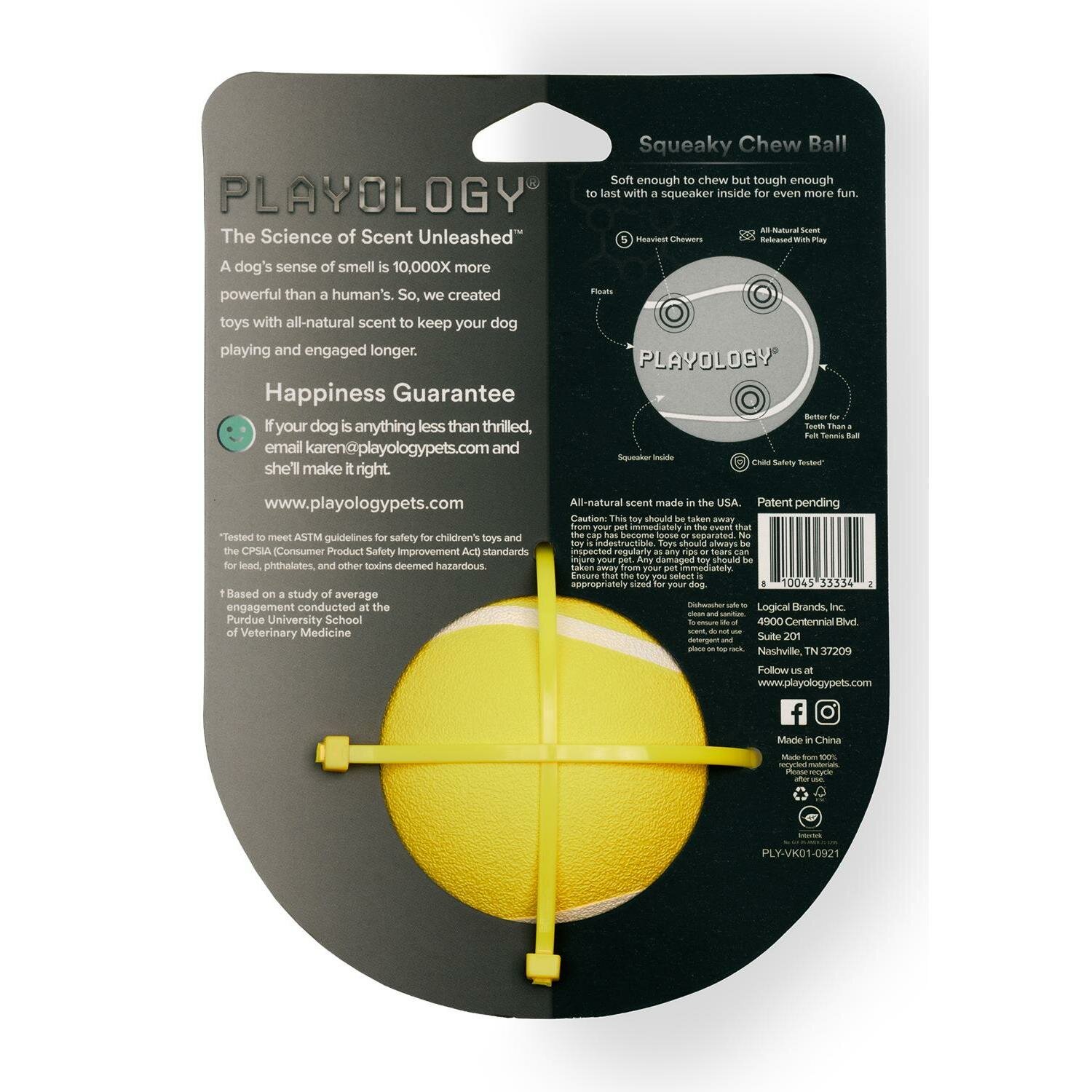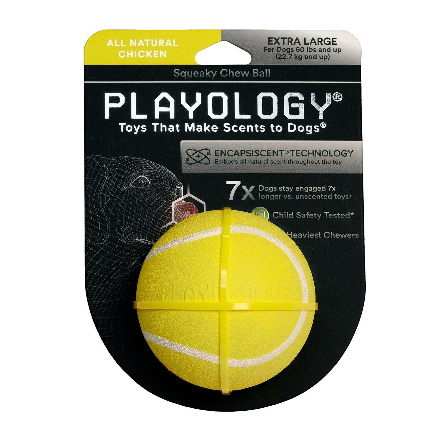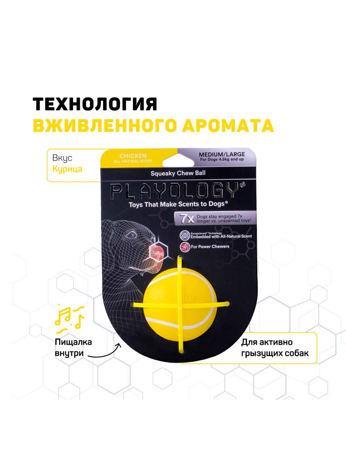 Playology Игрушка для собакPlayology жевательный мяч SQUEAKY CHEW BALL 8 см для собак средних и крупных пород с пищалкой и с ароматом курицы, цвет желтыйPlayology ® разрабатывает ароматизированные игрушки, изготовленные из безопасных для собак материалов, которые занимают собаку в 7 раз дольше, чем игрушка без запаха. В основу каждой игрушки заложена технология «вживленного аромата» (ENCAPSISCENT®), ароматизированные частицы по запатентованной формуле буквально внедрены на микроскопическом уровне в прочный материал игрушек, будь то резина или текстиль, что делает их абсолютно уникальными и долго сохраняющими аромат. Жевательный мяч SQUEAKY CHEW BALL 8 см с пищалкой подходит для мало и умеренно грызущих взрослых собак всех возрастов (от 22,7 кг и более). Обратите внимание: нет неразрушимых игрушек, любую игрушку следует регулярно осматривать и забирать, если игрушка повреждена, чтобы исключить травмирование питомца. Убедитесь, что выбранная вами игрушка подходит по размеру и темпераменту вашей собаки. Не подлежит обязательной сертификации. СоставРезина