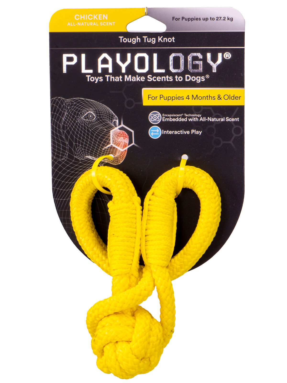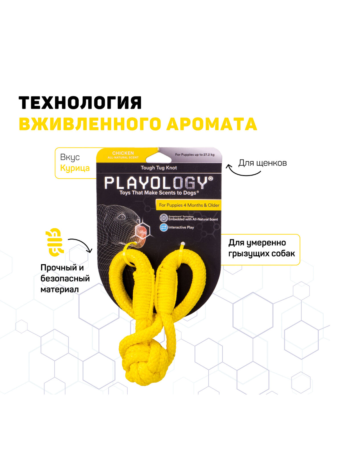 Playology Игрушка для щенковPlayology жевательный канат TOUGH TUG KNOT для щенков 4-8 месяцев с ароматом курицы, цвет желтыйPlayology ® разрабатывает ароматизированные игрушки, изготовленные из безопасных для собак материалов, которые занимают собаку в 7 раз дольше, чем игрушка без запаха. В основу каждой игрушки заложена технология «вживленного аромата» (ENCAPSISCENT®), ароматизированные частицы по запатентованной формуле буквально внедрены на микроскопическом уровне в прочный материал игрушек, будь то резина или текстиль, что делает их абсолютно уникальными и долго сохраняющими аромат. Канат Tough Tug Knot изготовлен по технологии формованного волокна, предотвращающей разрыв веревки на длинные куски, которые могут быть опасны для вашего питомца при проглатывании. Конструкция каната с узелками идеально подходит для щенков и помогает в развитии. Подходит для щенков 4-8 месяцев (весом до 27,2 кг) в период прорезывания зубов для интерактивных игр. Обратите внимание: нет неразрушимых игрушек, любую игрушку следует регулярно осматривать и забирать, если игрушка повреждена, чтобы исключить травмирование питомца. Убедитесь, что выбранная вами игрушка подходит по размеру и темпераменту вашей собаки. Не подлежит обязательной сертификации.СоставТкань/Полиэстер