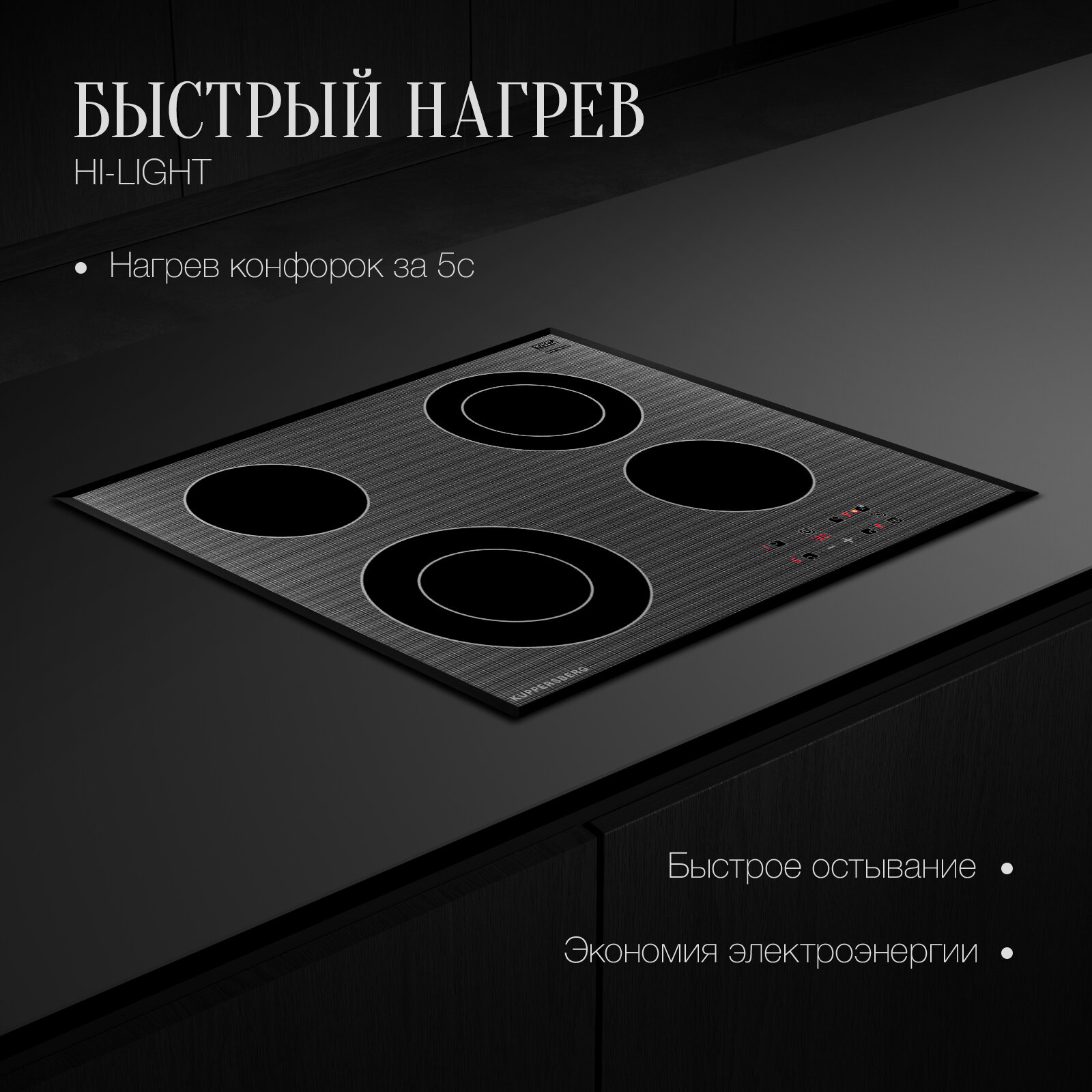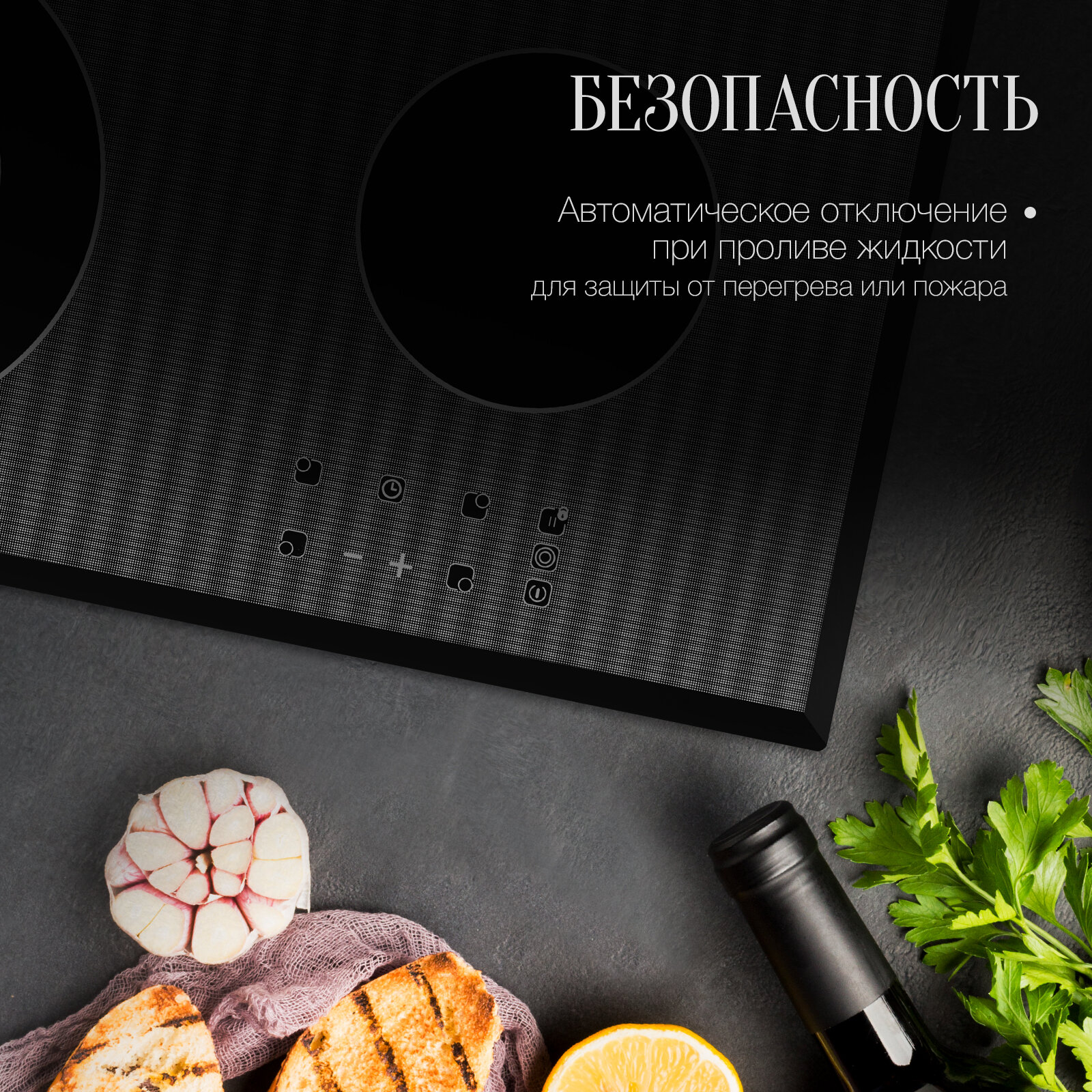 | Безопасность | индикатор остаточного тепла, защитное отключение конфорок, кнопка блокировки панели |