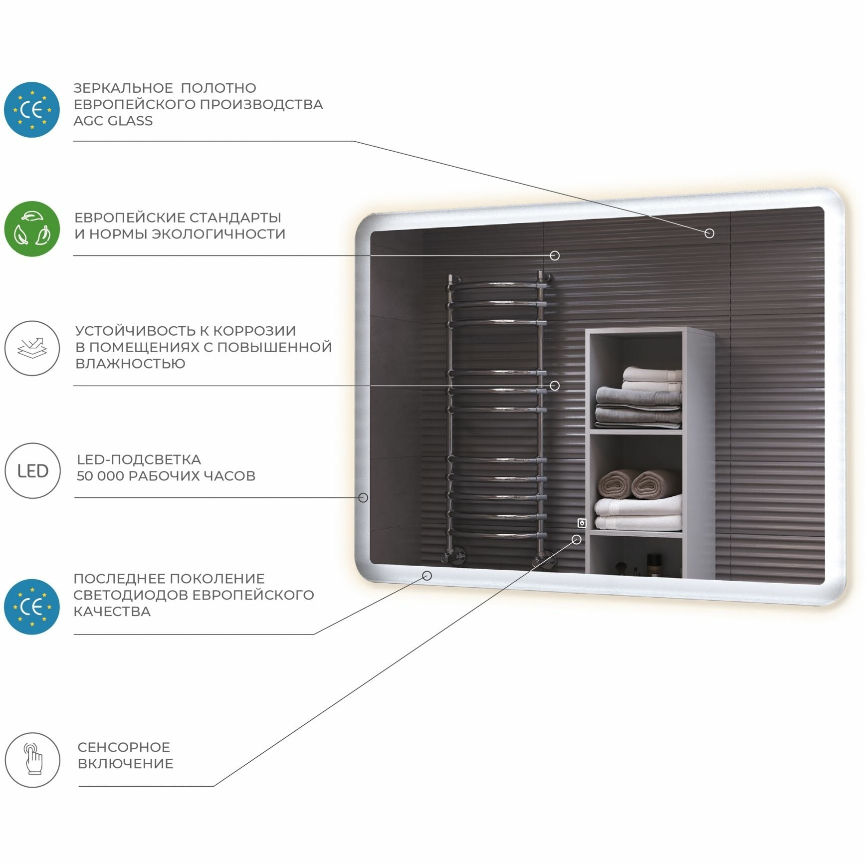 Хорошее качественное зеркало с бюджетной стоимостью. Покупали сравнительно недавно, пока за время использования минусов не обнаружили. Свет приятный и в меру яркий, дополнительный выключатель не требуется, включается на сенсорную кнопку. Само зеркало без дефектов и царапин.
