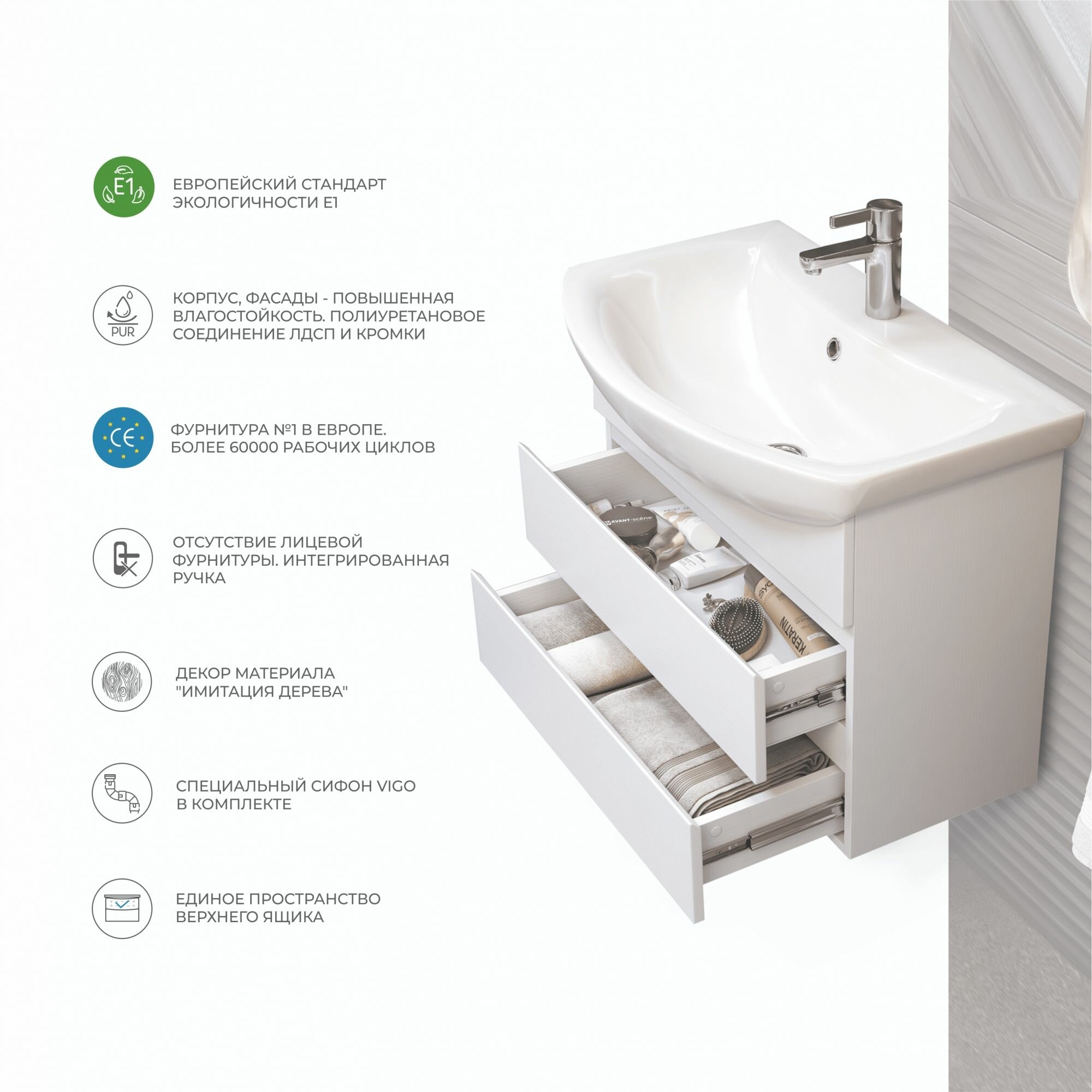 Тумба под раковину Vigo Wing 70 tp. WIN. BAL.70.2Yбелый. Компания VIGO выбирает для своего производства европейские экологически чистые материалы. Ламинированные ДСП высшего сорта с герметично закрытыми кромками – класса эмисси Е1. Надежное покрытие материала препятствует испарению формальдегида и повышает его безопасность для окружающих. Соответствие требованиям подтверждается обязательными сертификатами и Декларацией соответствия. Повышенная влагостойкость. Полиуретановое соединение ЛДСП и кромки. Технология применения полиуретановых клеев исключает проникновение влаги в структуру древесных плит, что значительно повышает их паро-и влагостойкость. Использование таких материалов позволяет мебели VIGO успешно противостоять высокой влажности и перепадам температур. Более 60 000 рабочих циклов фурнитуры. Мебель комплектуется дверными петлями со встроенными доводчиками и направляющими плавного закрывания. Направляющие плавного закрывания на ящиках надежны, долговечны, обладают оптимальной грузоподъемностью, обеспечивают стабильную работу ящиков и равномерный ход