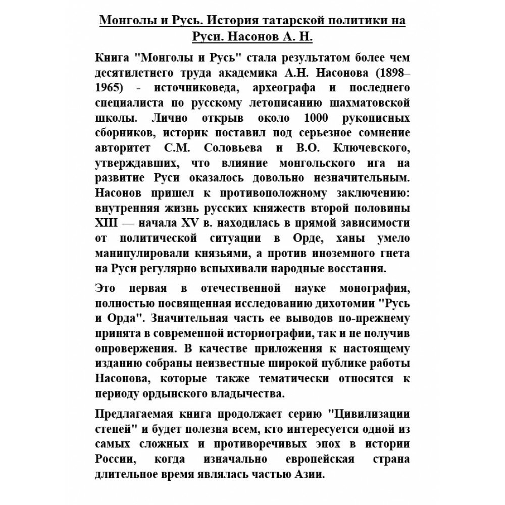 Это первая в отечественной науке монография, посвященная исследованию дихотомии "Русь и Орда". Значительная часть ее выводов по-прежнему принята в современной историографии, так и не получив опровержения. В качестве приложения к настоящему изданию собраны неизвестные широкой публике работы Насонова, которые также тематически относятся к периоду ордынского владычества.