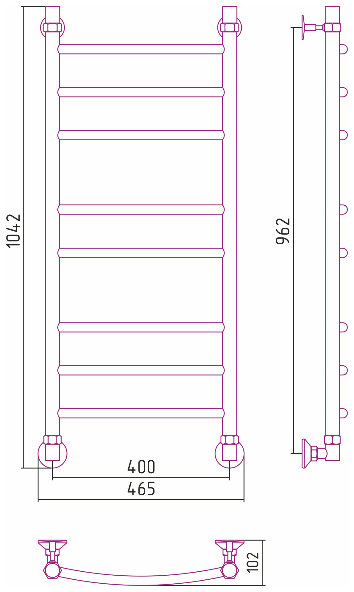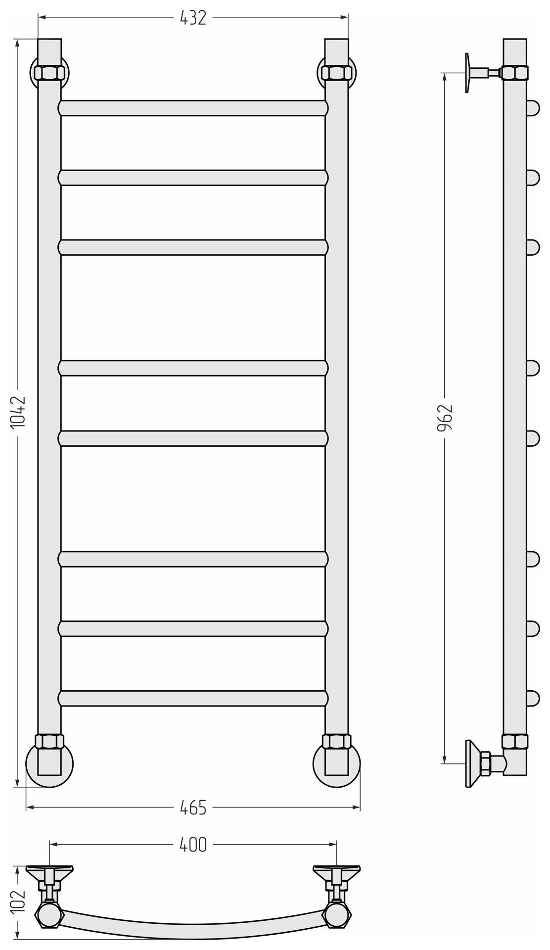 | ВКоробке | Полотенцесушитель - 1 шт. Комплект отражателей - 1 шт. Комплект декоративных заглушек - 1 шт. Телескопический кронштейн - 2 шт. Кран Маевского - 1 шт. Накидная гайка - 1 шт. Муфта - 1 шт. Инструкция - 1 шт. |