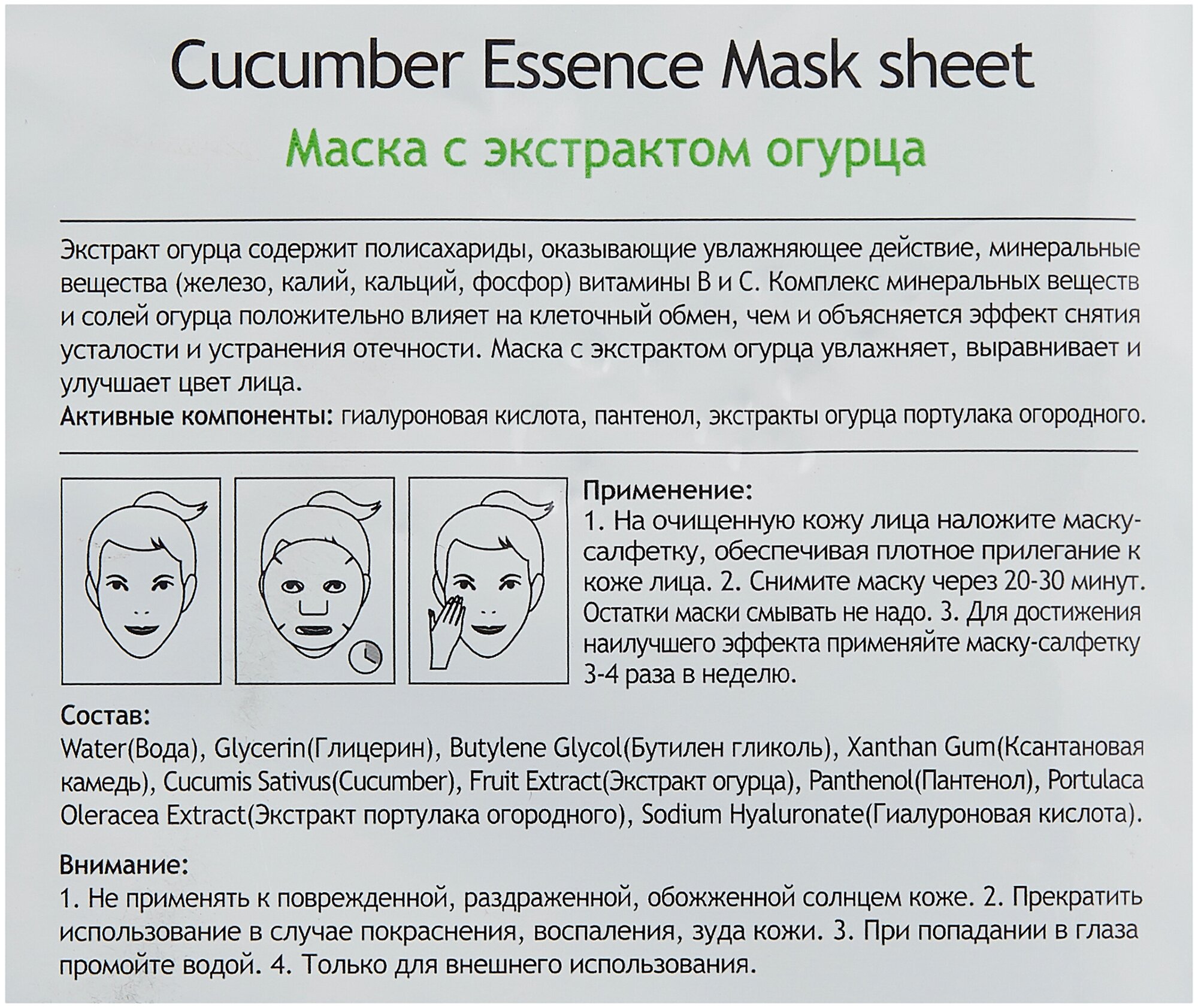 Экстракт огурца содержит полисахариды, оказывающие увлажняющее действие, минеральные вещества (железо, калий, кальций, фосфор) витамины В и С. Комплекс минеральных веществ и солей огурца положительно влияет на клеточный обмен, чем и объясняется эффект снятия усталости и устранения отечности. Маска с экстрактом огурца увлажняет, выравнивает и улучшает цвет лица. Активные компоненты: гиалуроновая кислота, пантенол, экстракты огурца портулака огородного.