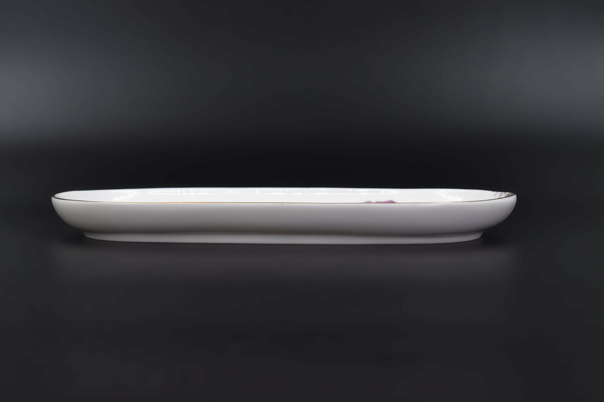 Длина блюда — 20,5 см, форма овальная, с бортиками. Отлично подходит для нарезки, сервировки закусок, подачи на праздничный стол.
