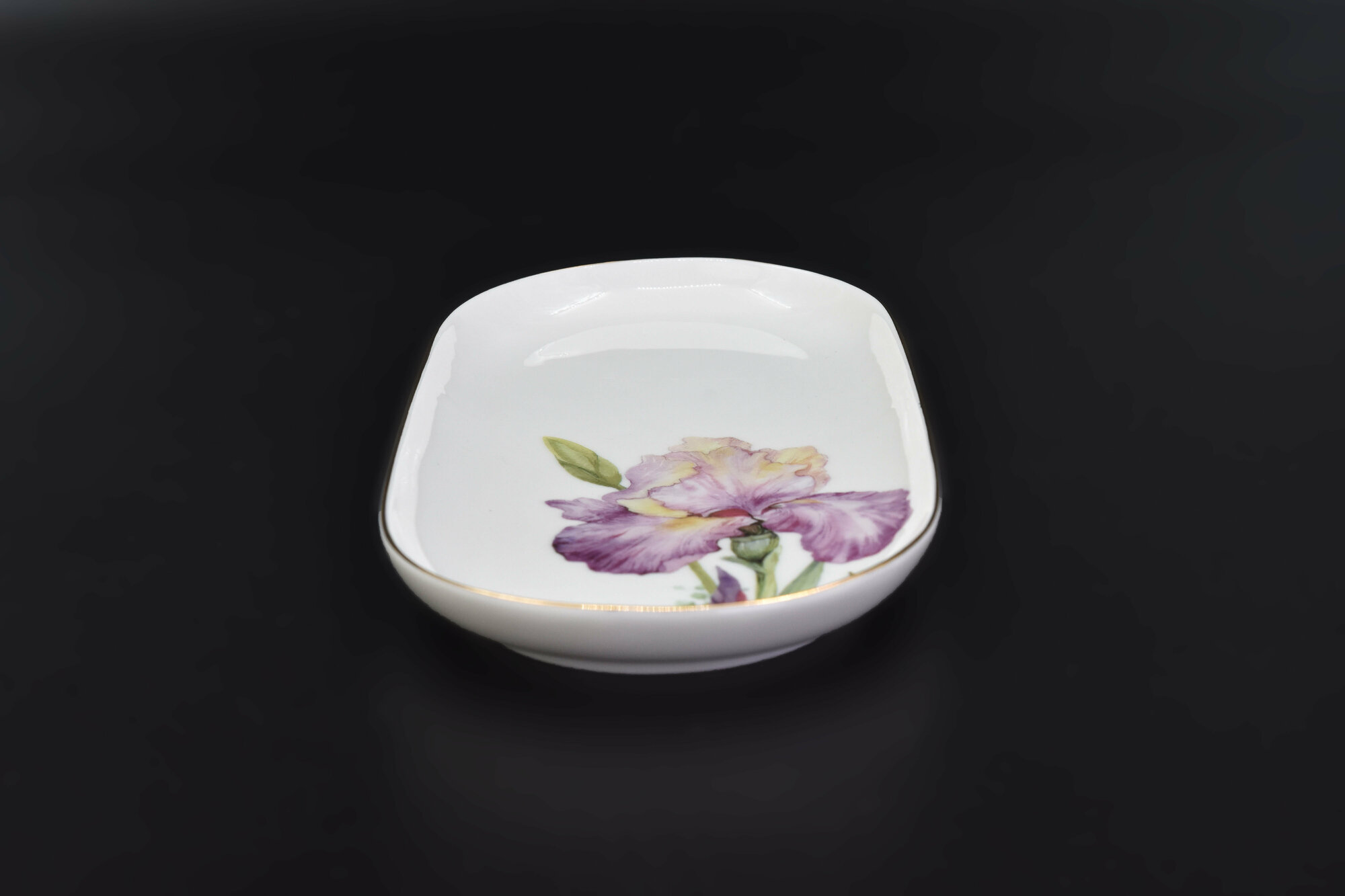 - Уникальный дизайн с изысканным рисунком ирисов и золотой окантовкой — акцент на праздничном столе