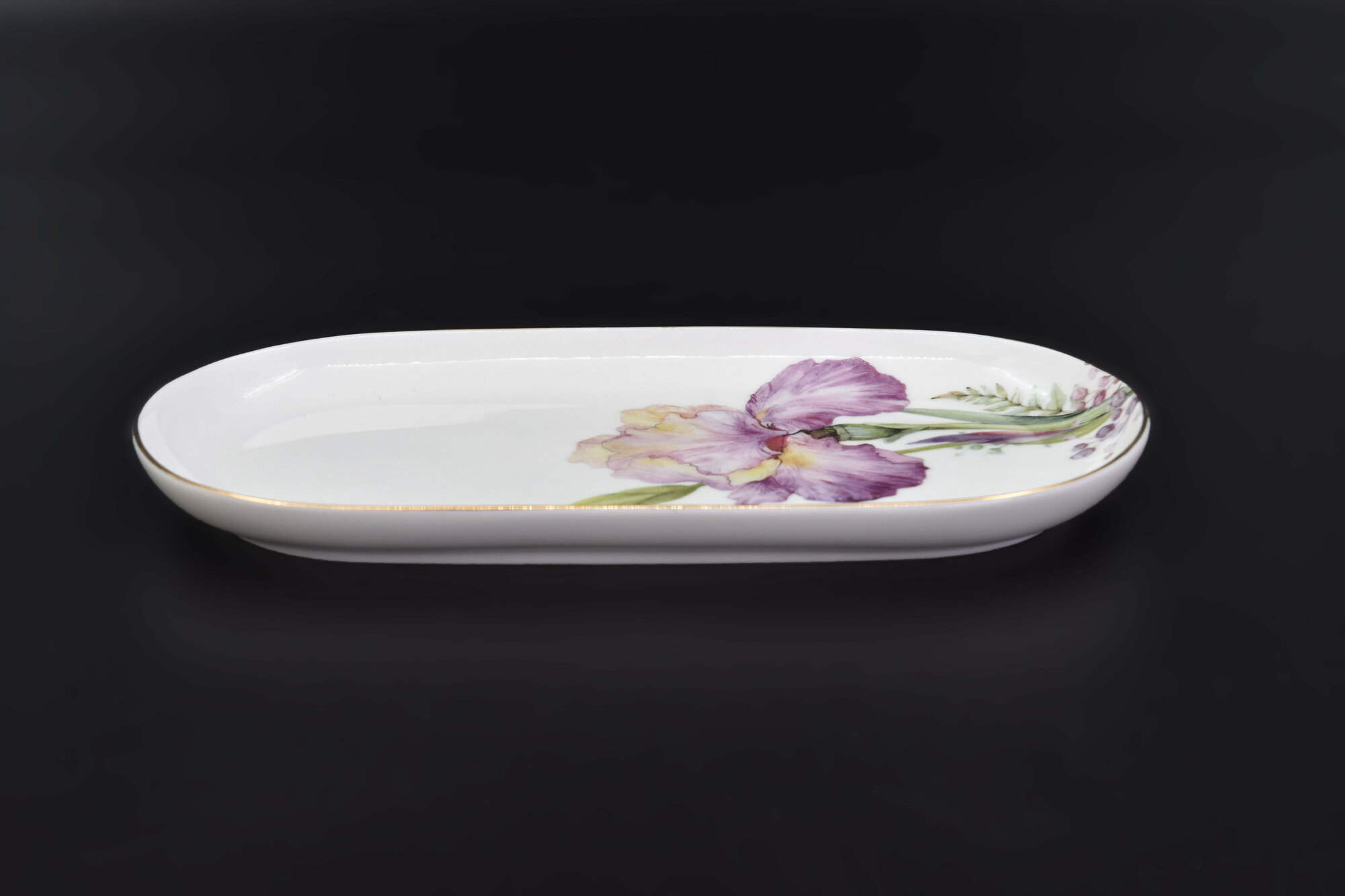 Блюдо керамика, сервировочное, овальное, 20.5 см Irises от Lefard — это выбор тех, кто ищет не просто посуду, а стильный акцент для сервировки. Овальная форма и бортики делают его удобным для нарезки и подачи закусок, фруктов, десертов. Материал — премиальный фарфор: долговечен, не впитывает запахи, подчеркивает изысканность блюда. Золотая окантовка и рисунок ирисов создают праздничное настроение, что особенно актуально для подарков и особых случаев.