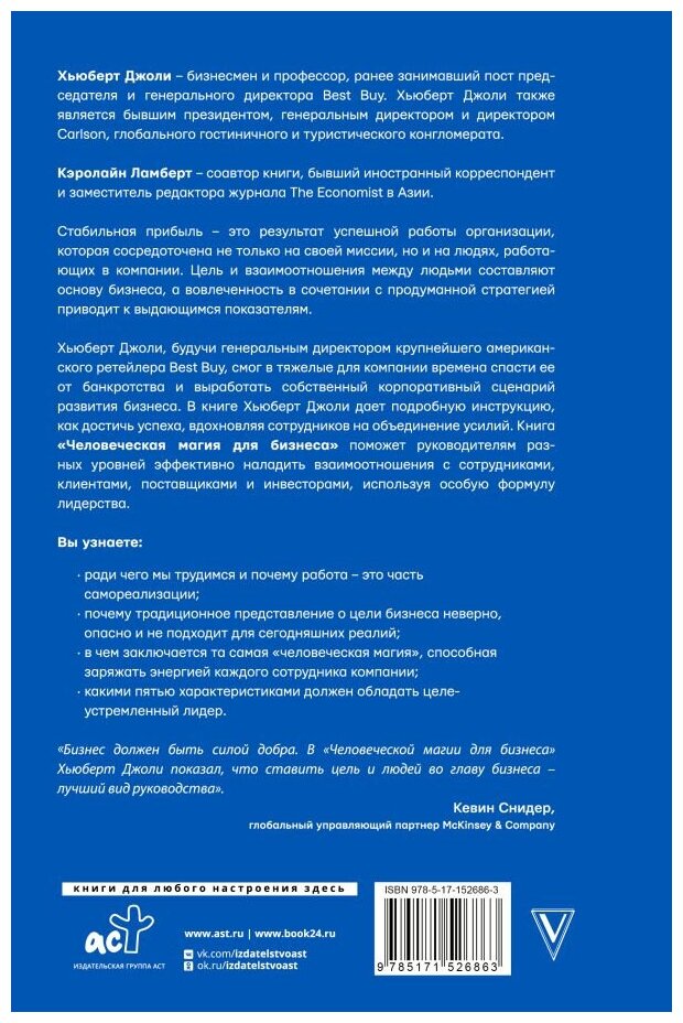 Хьюберт Джоли, будучи генеральным директором крупнейшего американского ретейлера Best Buy, смог в тяжелые для компании времена спасти ее от банкротства и выработать собственный корпоративный сценарий развития бизнеса. В книге Хьюберт Джоли дает подробную инструкцию, как достичь успеха, вдохновляя сотрудников на объединение усилий. Книга "Человеческая магия для бизнеса" поможет руководителям разных уровней эффективно наладить взаимоотношения с сотрудниками, клиентами, поставщиками и инвесторами, использую особую формулу лидерства.