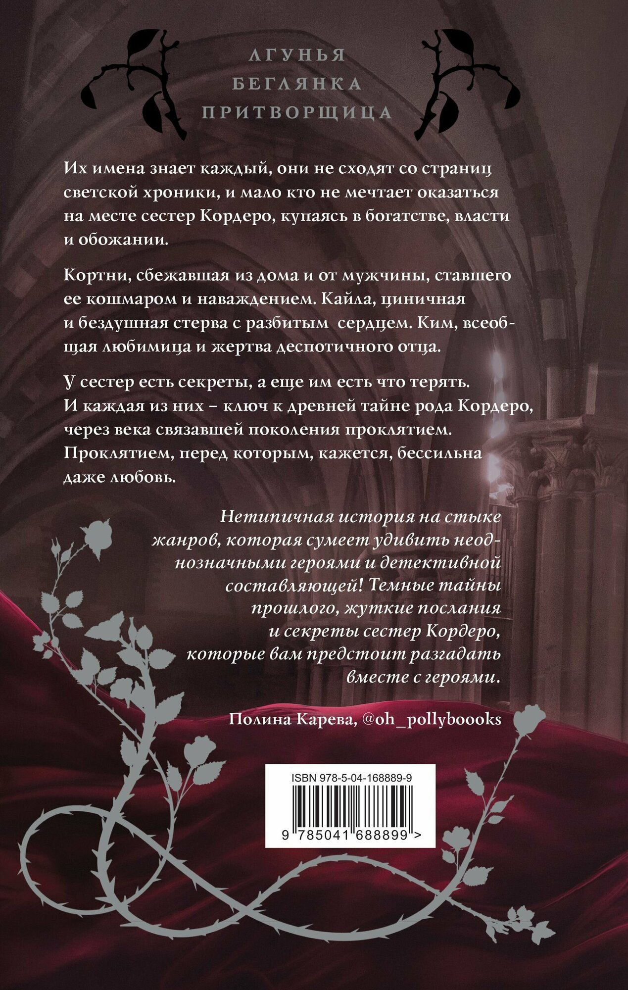 В эту книгу вошел цикл автора "Сёстры Кордеро" - "Лгунья", "Беглянка" и "Притворщица". Первые две книги ранее уже издавались, а вот третья - "Притворщица" ("Изгнанница") выходит в свет впервые. Сложный цикл, неоднозначный и драматичный. Это больше темное фэнтези, но с сильными любовной и детективной линиями. Каждая из историй рассказывает об одной из сестер. Первая - о стойкой Кортни, сильной во многом, кроме любви, вторая - о легкомысленной на первый взгляд Кайле, третья - о самой юной сестре Ким, которой предстоит бороться со своими внутренними демонами. Когда начинаешь читать книгу, тебя окутывает тяжелая атмосфера, в которой трудно дышать, а из шкафов начинают вываливаться скелеты. Средняя сестра Кортни, когда-то сбежавшая из дома, чтобы учиться вдали от удушливой атмосферы особняка Кордеро, возвращается в родной город. Умерла ее мачеха. Но оставаться здесь после похорон Кортни не хочет. Однако все идет не по плану. Кто-то объявляет охоту на сестер и начинает их запугивать. Погибает подруга одной из сестер и полицейский. Все персонажи вызывают двойственное отношение. Тот же Герберт, который безумно любит Кортни, с одной стороны, самоотверженно защищает сестер, с другой - его соблазнение девушки с использованием элементов БДСМ, хитрость и др. вызывают отторжение. Вообще все персонажи крайне неоднозначны. Но все же поражает сила воли сестер, их желание выжить в семье, где нет матери, а отец использует насилие по отношению к дочерям (не сексуальное, но от этого не легче), особенно к младшей. Не случайно у Ким, как говорится, крыша поехала. Постоянное воздействие отца на ее мозг почти сломало девушку. Так родилось чудовище. И в то же время именно она стала главной в борьбе с убийцей. Интересен талантливый менталист (в общем-то психиатр) Хантер. Он смог сделать невозможное. Старшая Кайла кажется наиболее слабой и легкомысленной. Но это не так. Имея жесткого отца-абьюзера, она просто надевала маску, с которой ей легче всего было жить. Зато как она раскрылась в качестве матери, несмотря на те ужасы, что творил с ней отец. В книге много тайн, связанных с семьей Кордеро, лжи, секретов, темных страстей. Но в самом центре событий окажется проклятие главы клана, прошедшее через века, гибель многих и многих ради мечты одного о бессмертии. Любимых героев в этой книге для меня нет, но трилогия оставляет сильное впечатление. Это не так книга, которую забываешь на второй день. Она заставляет задуматься. Сюжет захватывает и не отпускает до последней страницы.Хотя эпилог третьей части все же вызывает вопросы. Украшают книгу несколько цветных иллюстраций Ирины Косулиной.