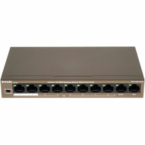 | Прочие особенности и свойства | Коммутатор Tenda TEF1110P-8-63W – сочетание передовых технологий и широких возможностей, которое может стать отличным выбором для использования в частной среде, а также в условиях малого и среднего бизнеса. В частности, с помощью этой модели возможно создание или улучшение существующих сетей, организация видеонаблюдения, IP-телефонии и других подобных решений., Коммутатор Tenda TEF1110P-8-63W относится к неуправляемому типу с коммутацией Store and Forward, при которой устройство не только считывает адрес получателя, но и анализирует поступающие данные на предмет ошибок. Кроме того, данная модель поддерживает различные протоколы безопасности, что делает работу в сети безопасной. Для подключения оборудования на лицевой панели коммутатора предусмотрено 10 сетевых портов, 8 из которых – с PoE-питанием. Также устройство отличается большой таблицей MAC-адресов, что дополнительно способствует большому количеству одновременных подключений и стабильно высокой производительности., Коммутатор также отличается компактными размерами, за счет чего может размещаться прямо на столе. Для удобства использования на лицевой панели расположена светодиодная индикация. В качестве источника питания используется сеть 220 В. Модель поставляется в фирменной упаковке вместе с силовым кабелем. |