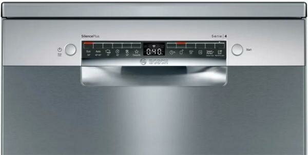 Посудомоечная машина Bosch выполнена в стильном цвете «нержавеющая сталь». Электронная панель управления представлена в черном цвете в виде кнопок и небольшого дисплея. Половинная загрузка предназначена для небольшого количества посуды, что существенно экономит воду и электроэнергию. При помощи Home Connect можно контролировать работу устройства не находясь дома через мобильное приложение. Функция SpeedPerfect+ ускоряет мытье посуды на 50%, не ухудшая качество процесса. Эта функция работает с помощью увеличения давления воды и температуры, что позволяет устранить даже самые стойкие загрязнения.