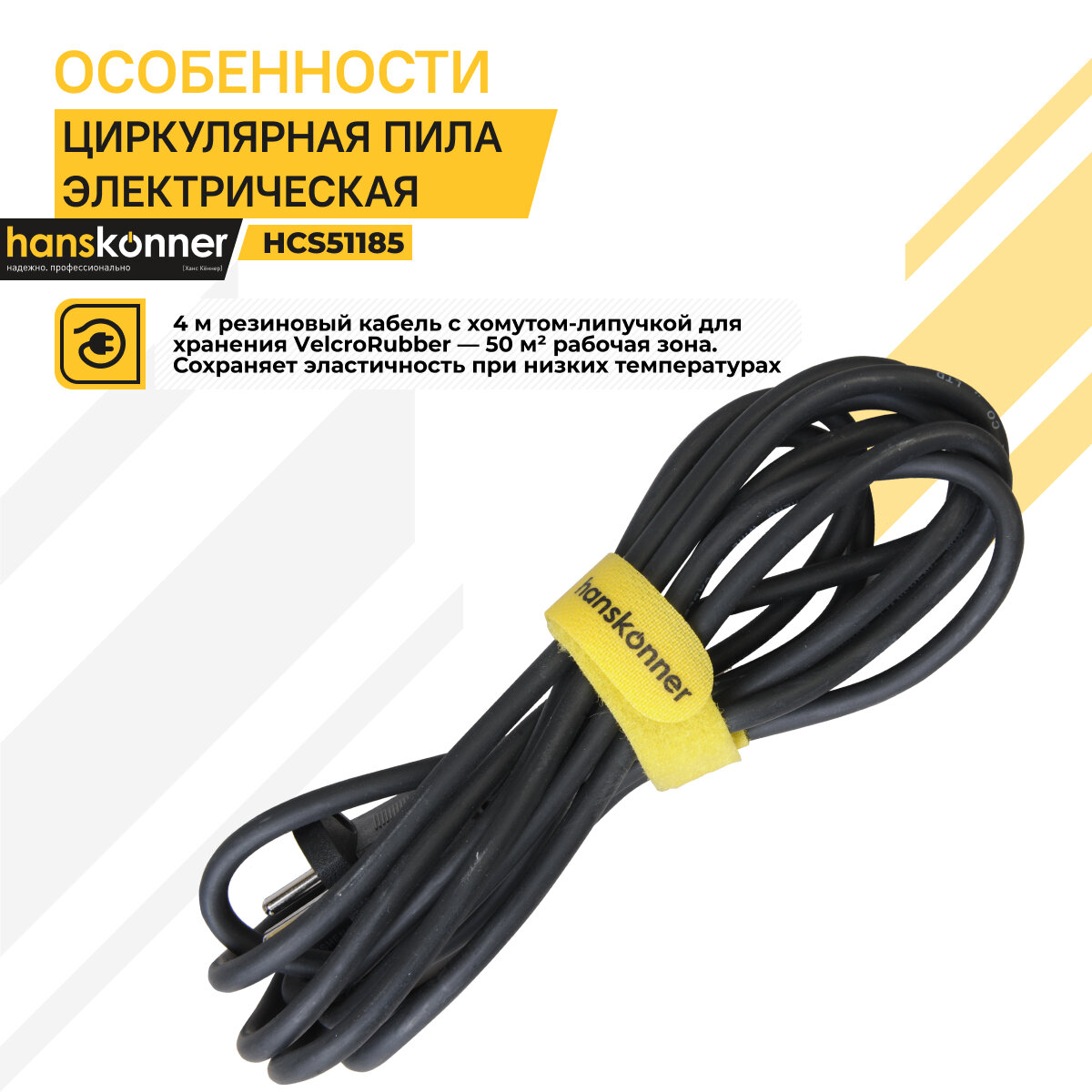 Резиновый морозостойкий кабель увеличенной длины 4м обеспечит свободное оперирование инструментом в рабочей зоне. Кабель оснащен фиксатором-липучкой для удобства его хранения и регулировки его длины при необходимости.