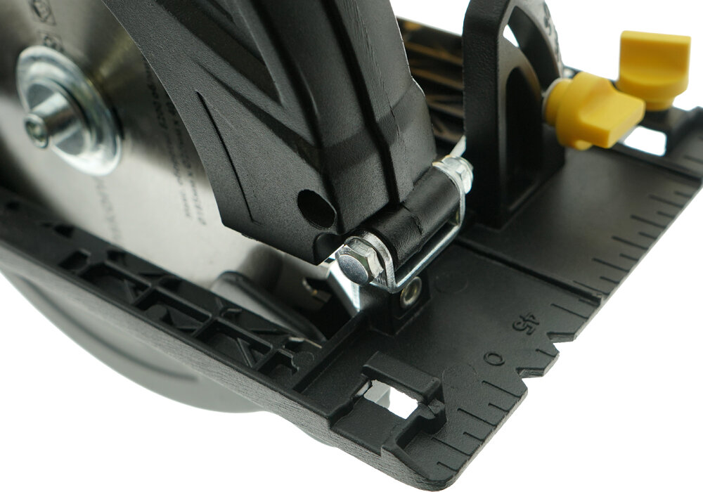Для быстрой смены пильного диска, предусмотрена клавиша блокировки вала. Продуманное расположение данного элемента исключает случайное нажатие.