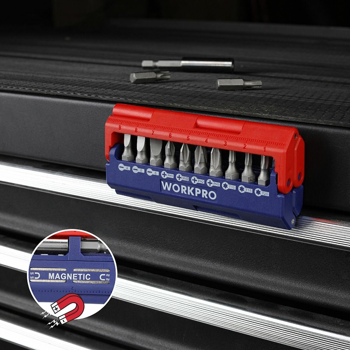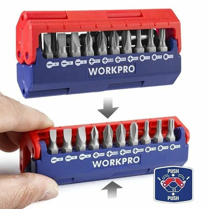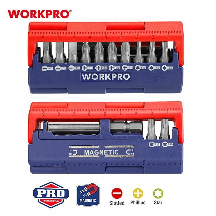 Набор бит WORKPRO 12 штук + магнитный держатель (WP221062)Набор бит 12 штук + магнитный держатель. Биты 25 мм. хром-ванадий: SL4, SL5, SL6, PH1, PH2, PH2, PH3, T10, T15, T20, T25, T30. Магнитный держатель бит 60 мм. Легкий доступ для извлечений бит простым нажатием. Магнитный кейс, который можно закрепить на металлической поверхности. Метрическая и дюймовая линейка (10 см./4") на корпусе.