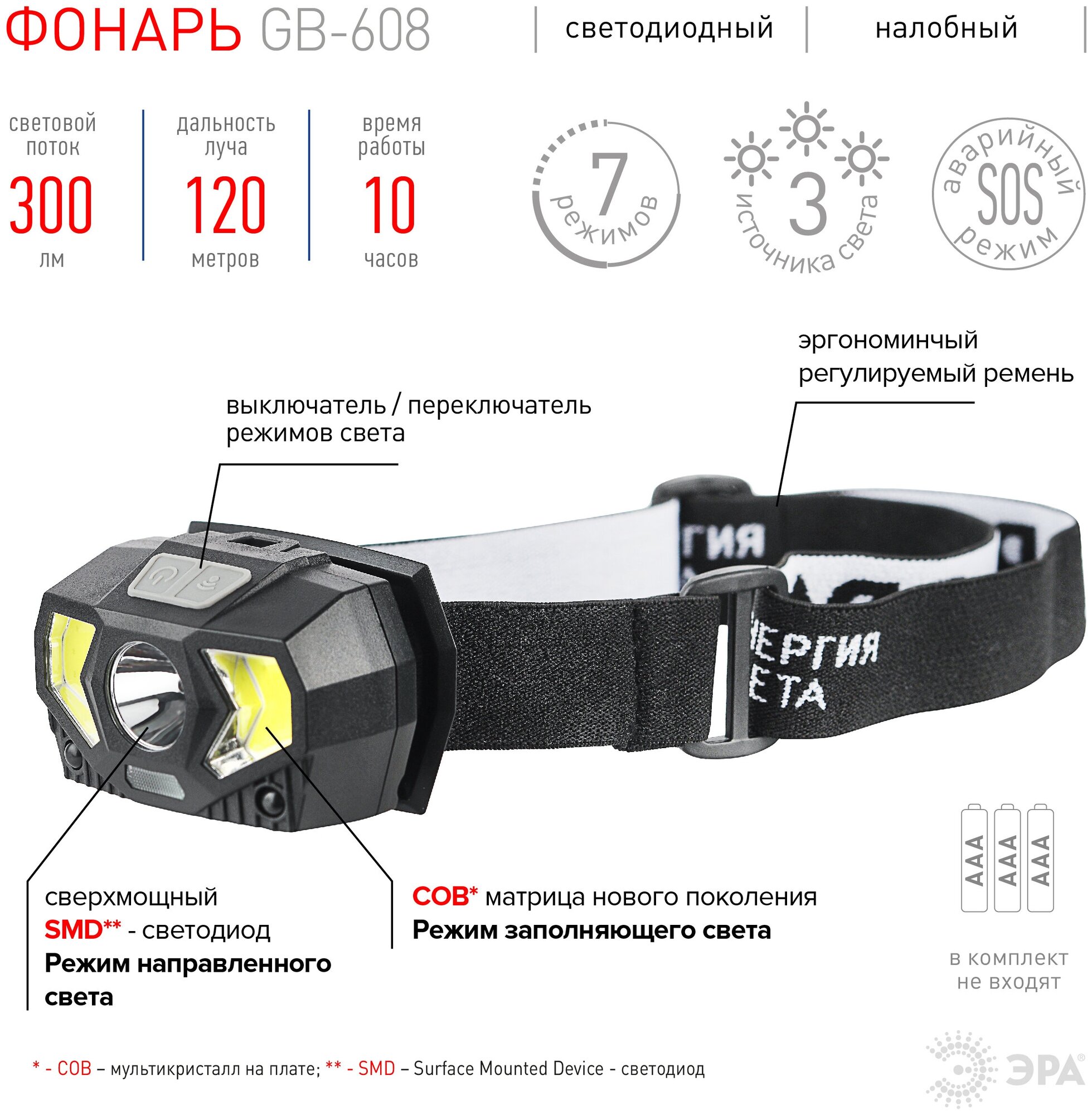 ЭРА – функциональный налобный LED-фонарь на батарейках (3 х ААА). В зависимости от ситуации применения позволяет выбирать любой из 7 режимов свечения. Легко регулировать яркость, включать дальний направленный свет (сверхмощный светодиод нового поколения) или широкое заполняющее освещение (СОВ-матрица «мультикристалл на плате»), а также режимы аварийного мигания, SOS.