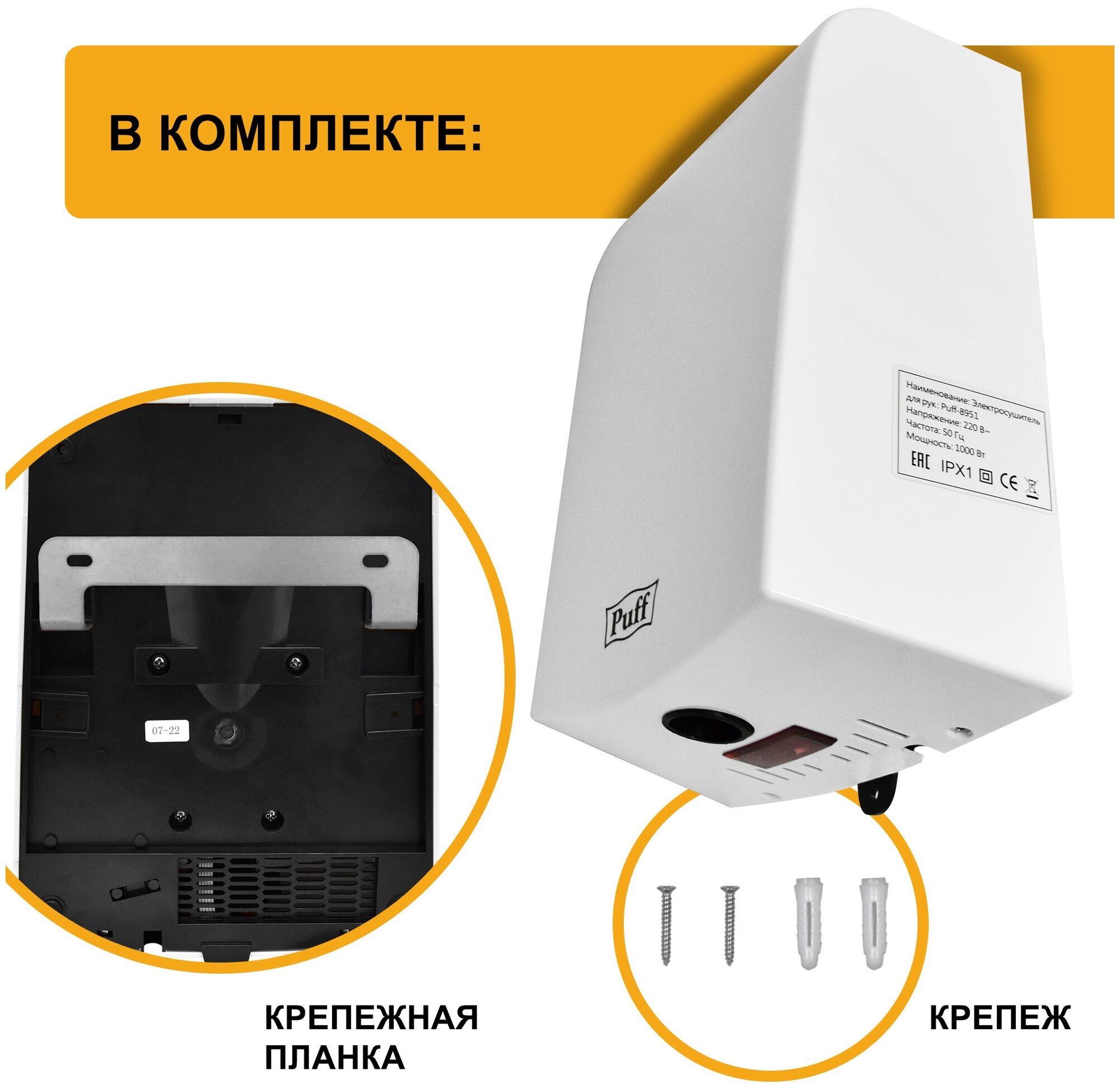 Puff – эталон надежности и качества. Электросушитель для рук высокоскоростной, белый, мощность 1, 0 кВт. Сушилка из ABS-пластика, скорость потока 90 м/с, сушка рук 8-12 сек, настенная, сенсорная. Он надежен и прост в использовании, такое электрополотенце для рук устанавливают в местах с повышенным трафиком посетителей. Сушитель для рук Puff-8951 это новая модель из линейки ультратонких электросушек, которые идеально подходят для небольших санитарно-технических помещений общественного назначения, а также для скрытого монтажа за зеркальные шкафы и панели. Наличие в электрооборудовании для рук HEPA (Хепа) фильтра позволяет удерживать частички пыли размером с микробов, поэтому такие сушители считаются более гигиеничными. Внедрение технологий по использованию HEPA фильтров в электросушителях началось совсем недавно, но уже сейчас понятно, что сушилки для рук, оснащенные такими фильтрами завоевывают все большую популярность. Сушилка крепится к стене с помощью крепежной планки и фиксируется специальным винтом, препятствующим снятию со стены. Зона срабатывания сенсора у полотенцесушителя 5-20 см.
